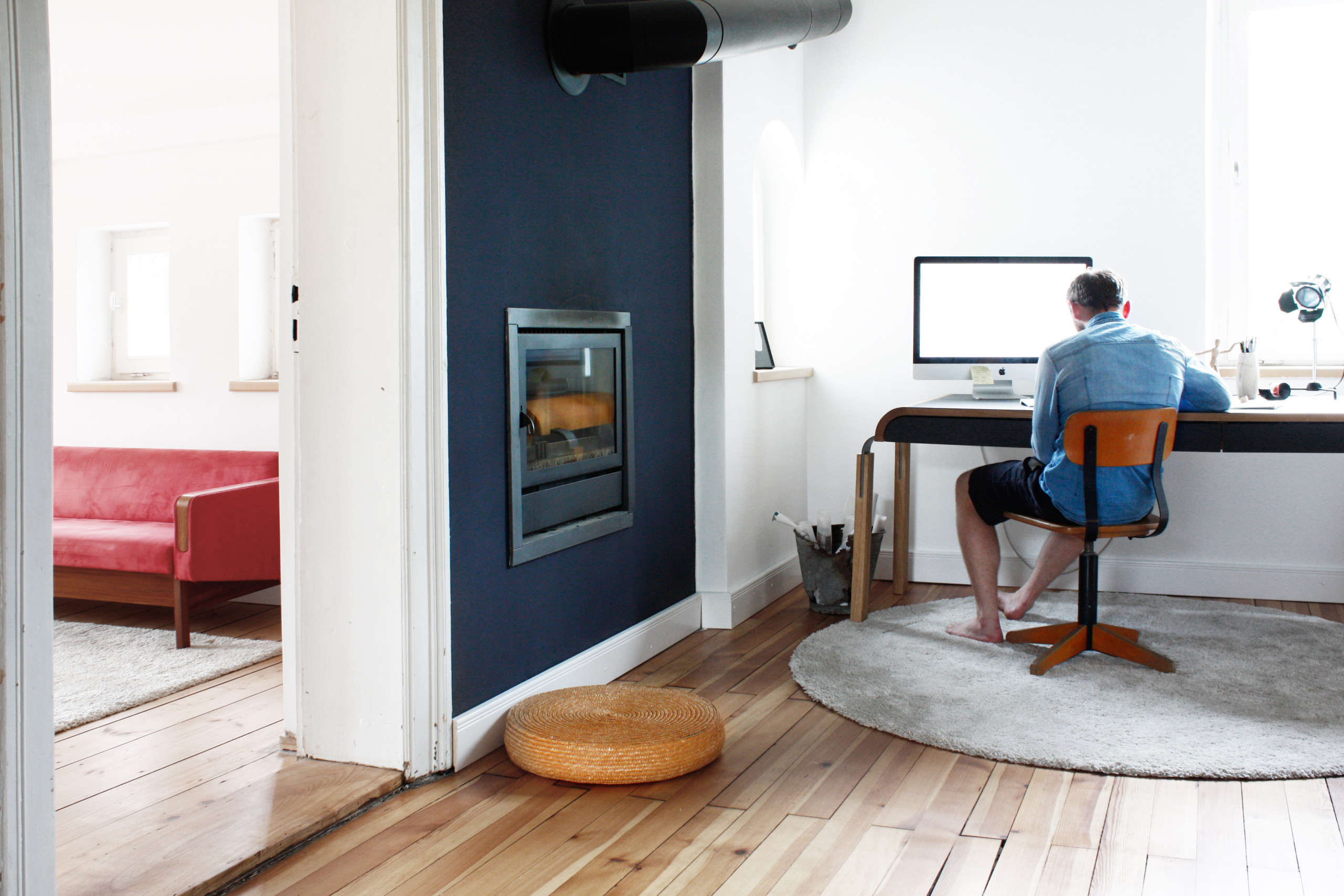 Das Büro strahlt Natürlichkeit und Besinnlichkeit aus – dank der nachtblauen und blütenweißen Wände, dem Kamin und einem Drehbürostuhl im Industrial-Look, den er bei einem Kunden vor dem Sperrmüll rettete.