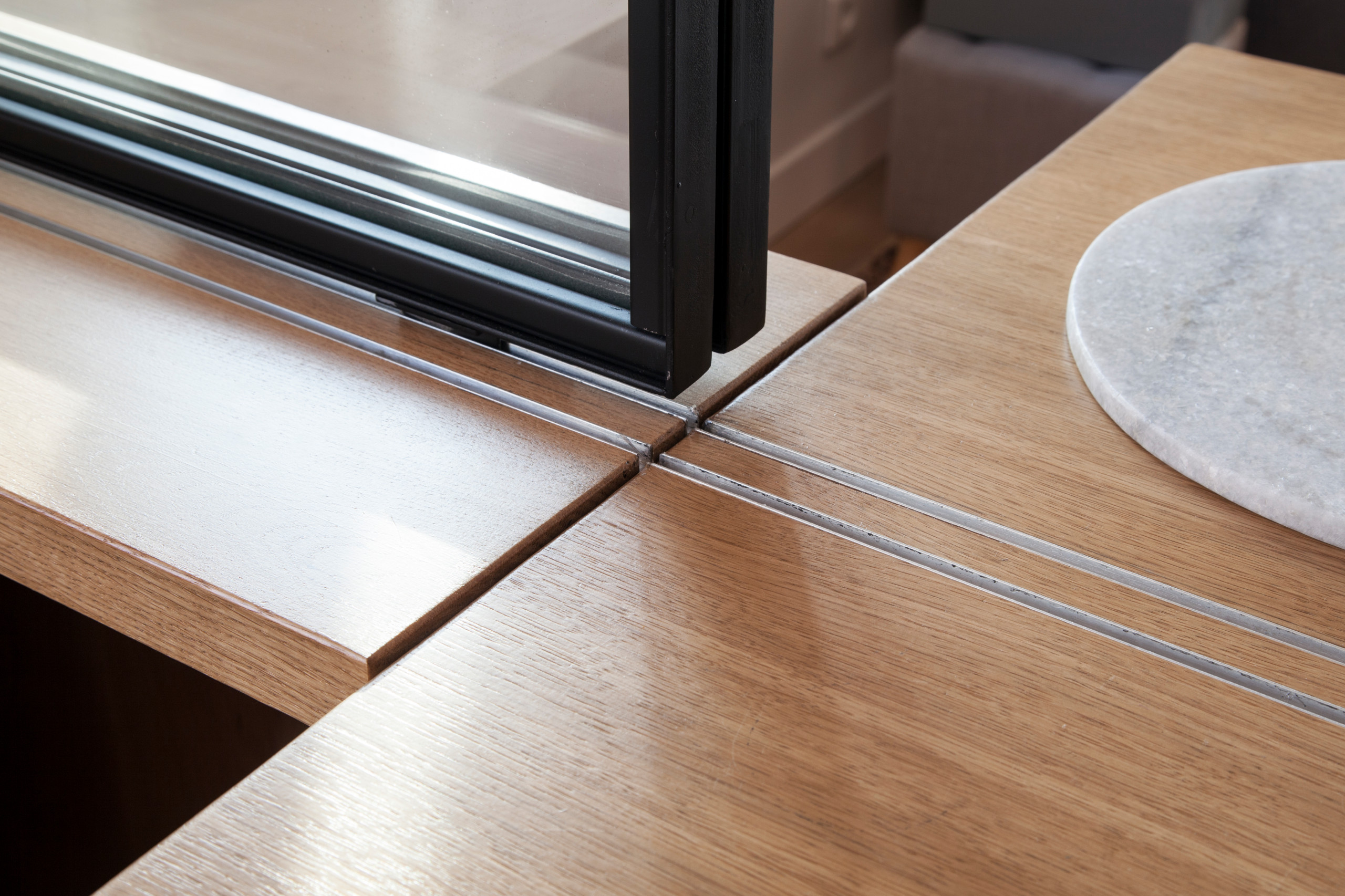 Für mehr Stabilität sind zwei der vier Rollen unter dem beweglichen Tresenteil mit Feststellern ausgestattet. Lösen lassen sie sich über eine spezielle Vorrichtung auf der Küchenseite. „Die Konstruktion musste sehr stabil sein, um das Schiebefenster zu tragen. Hier hat sich der Pfosten um das Heizungsrohr als sehr nützlich erwiesen. Neben den feststellbaren Rädern bietet er eine stabile Stütze, um den Tisch zu arretieren“, so Benaim.