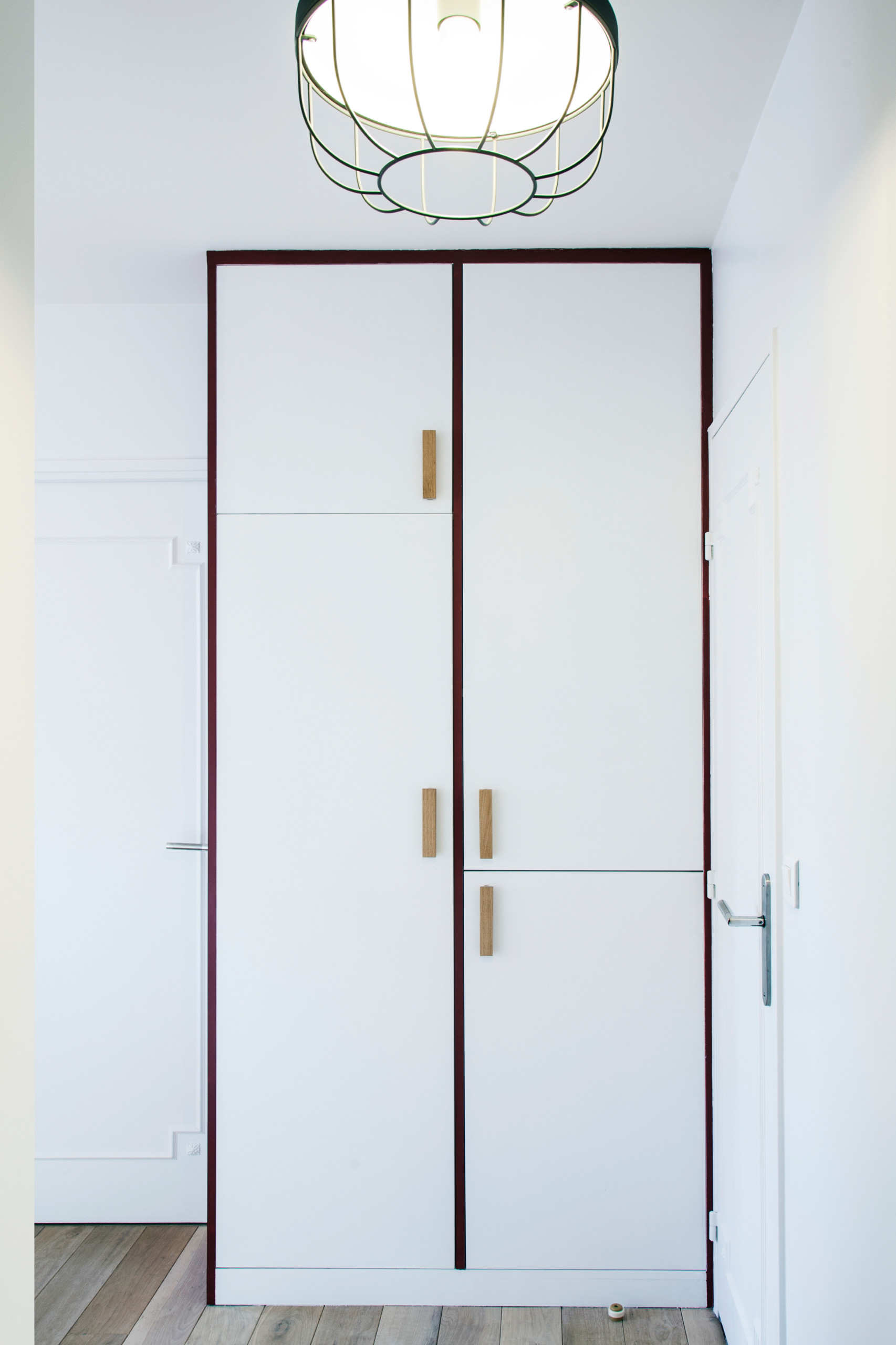 Für einen aufgeräumten, einheitlichen Look hat Benaim den Einbauschrank im Eingangsbereich passend zu den Küchenmöbeln anfertigen lassen. Seine weißen Oberflächen sorgen in dem fensterlosen Bereich für Helligkeit. „Da die Fliesen und die Metallelemente der Küche bereits sehr auffällig sind, haben wir uns im Eingangsbereich eher zurückgehalten“, so die Architektin.
