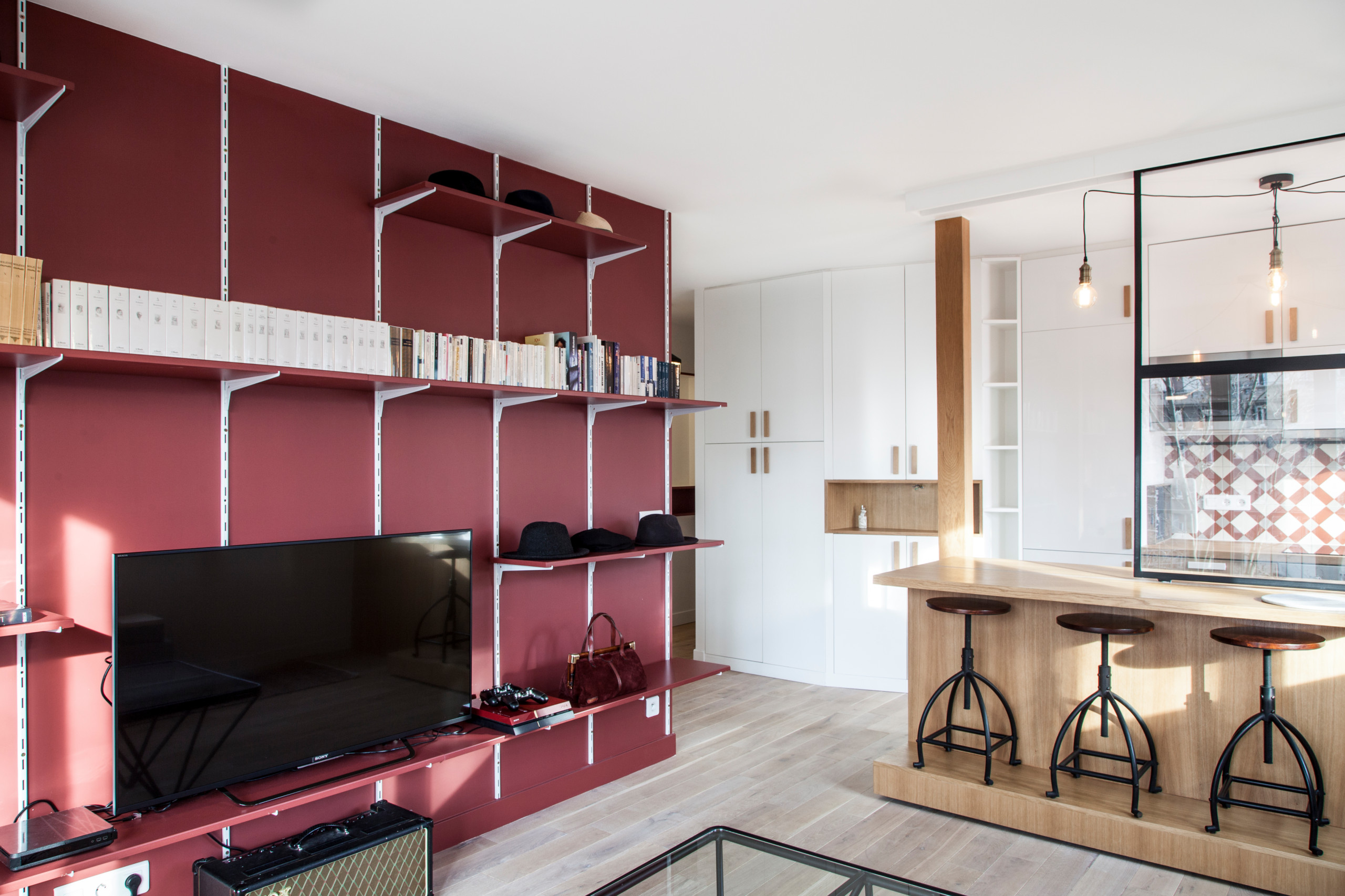 Adrien liebt es, Freunde und Familie zu bewirten, aber wenn er für sich allein kocht, will er sich auch zurückziehen können. Als er seine erste eigene Wohnung kaufte, ein 40 Quadratmeter großes Apartment im französischen Städtchen Levallois-Perret, stand ein flexibles Raumkonzept daher ganz oben auf seiner Prioritätenliste. Die Architektin Cyrielle Benaim half ihm dabei. „Neben viel Stauraum wünschte sich der Kunde vor allem eine Küche, die sich bei Bedarf zum Wohnzimmer hin öffnen lässt“, erzählt die Architektin. Die Lösung: ein hoch individuelles, maßgefertigtes Möbelstück, das als variabler Raumtrenner zwischen Küche und Wohnzimmer fungiert.