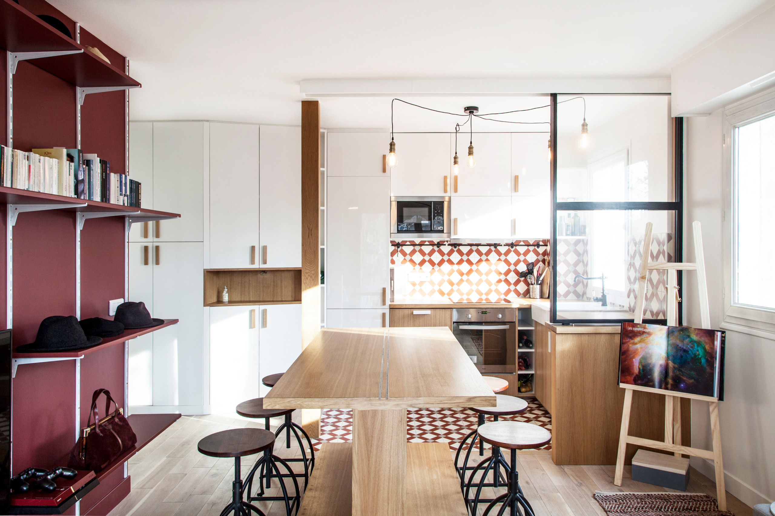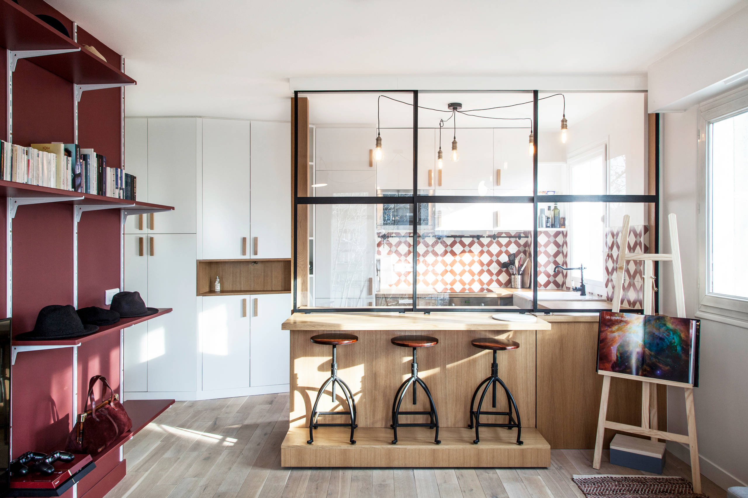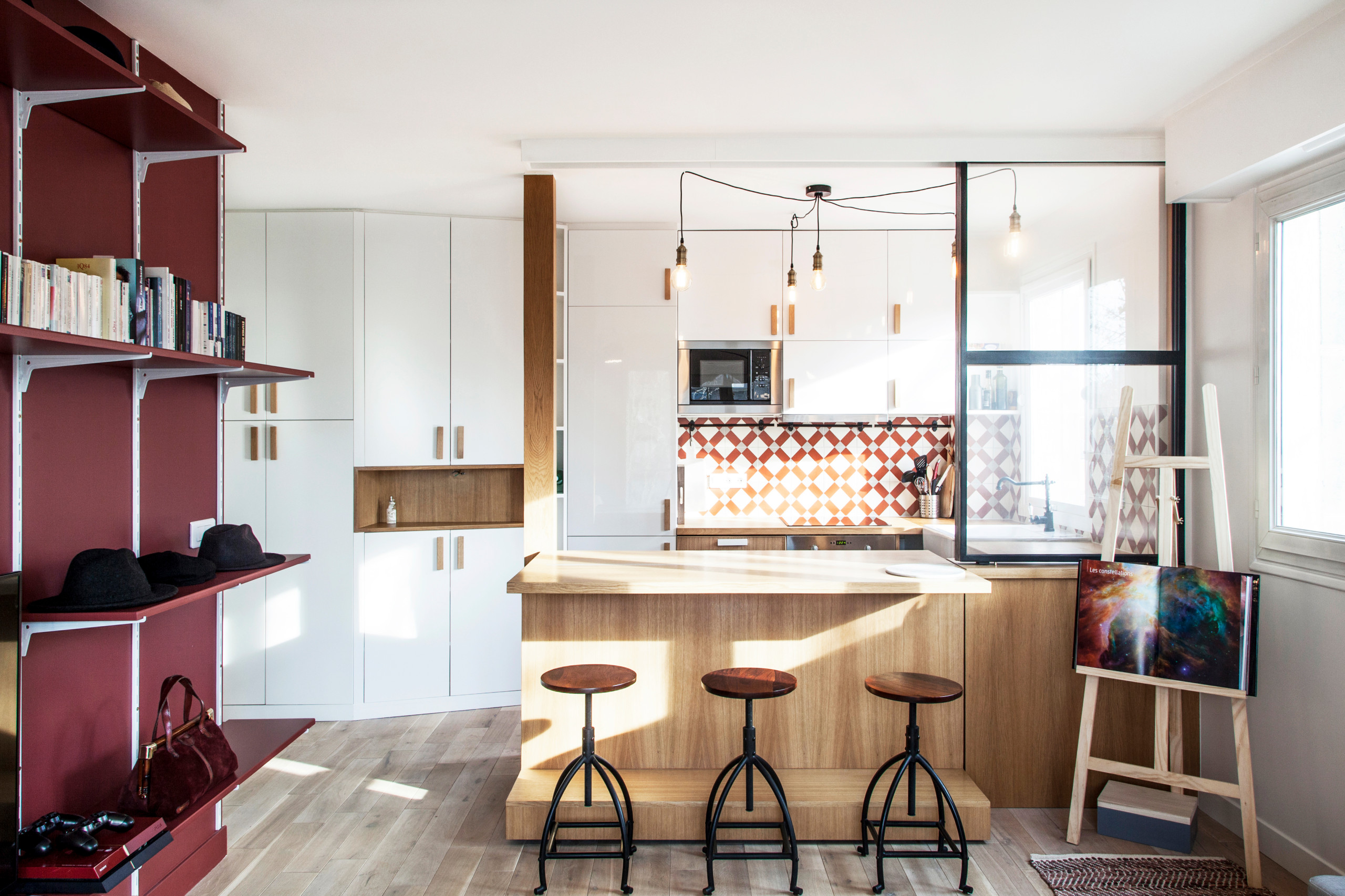 Ein Küchentresen, der Tisch und Raumteiler sein kann? In diesem französischen 40-qm-Apartment sorgt er für Stimmung
