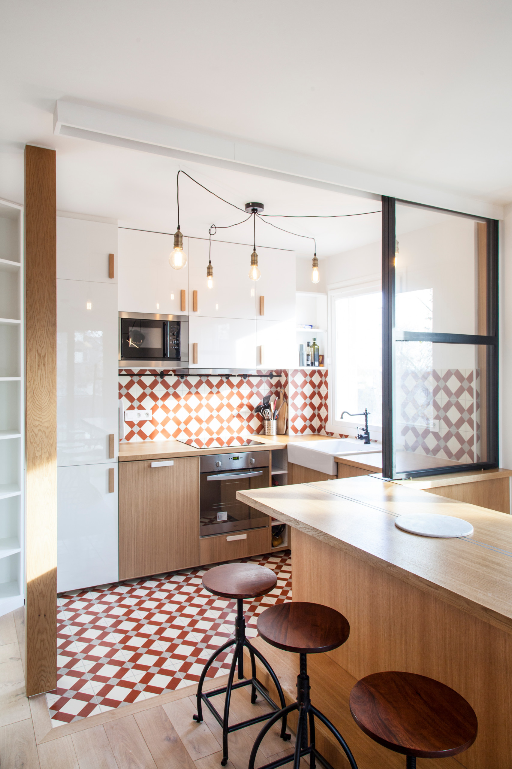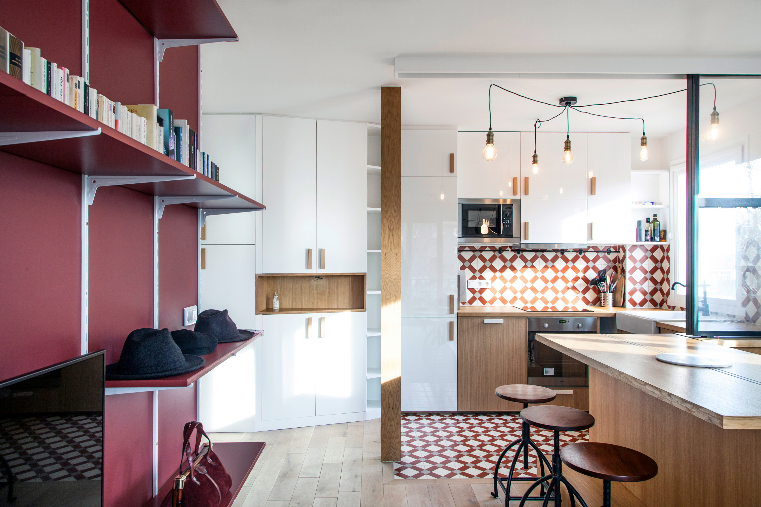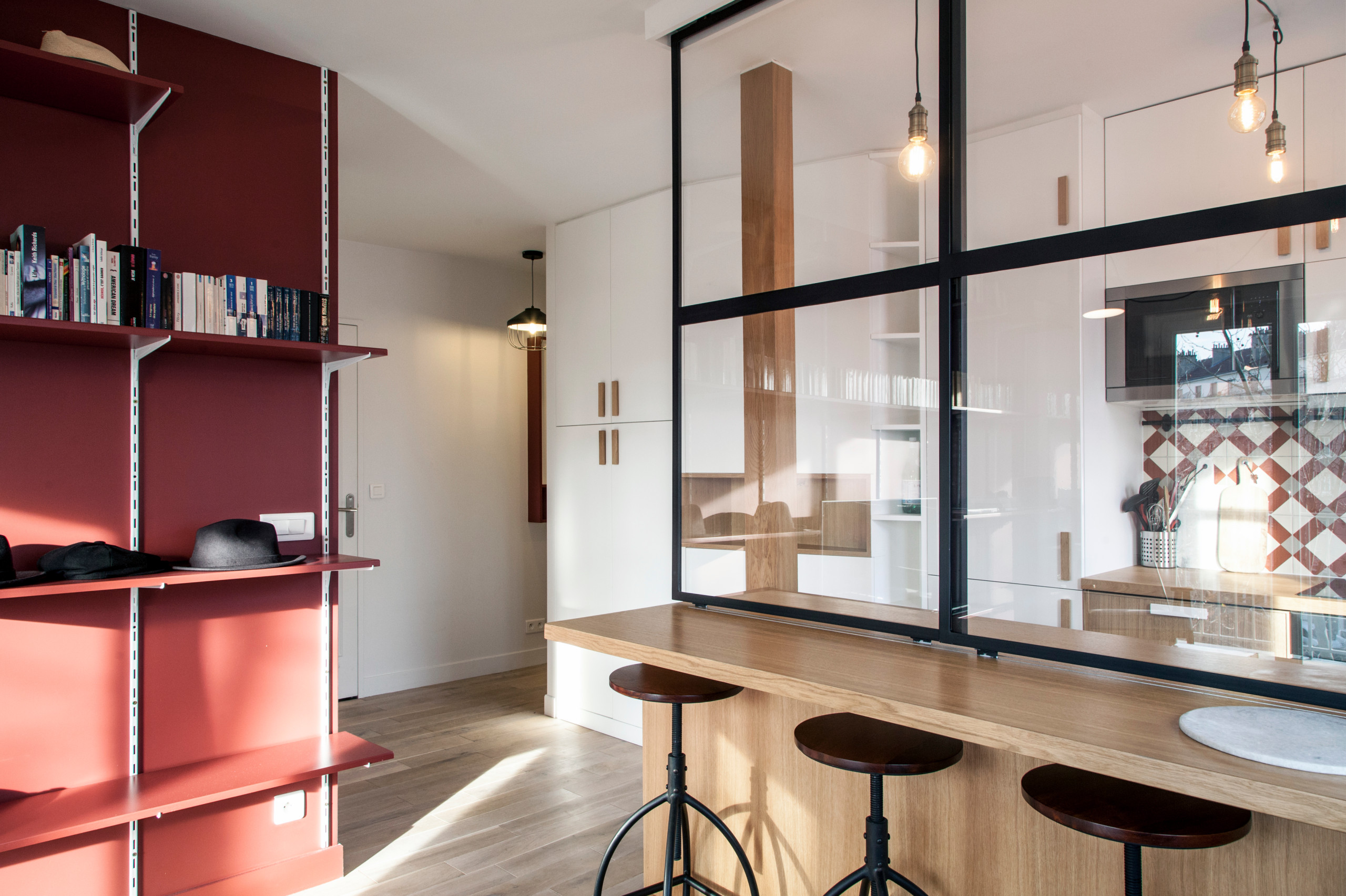 Ein Küchentresen, der Tisch und Raumteiler sein kann? In diesem französischen 40-qm-Apartment sorgt er für Stimmung
