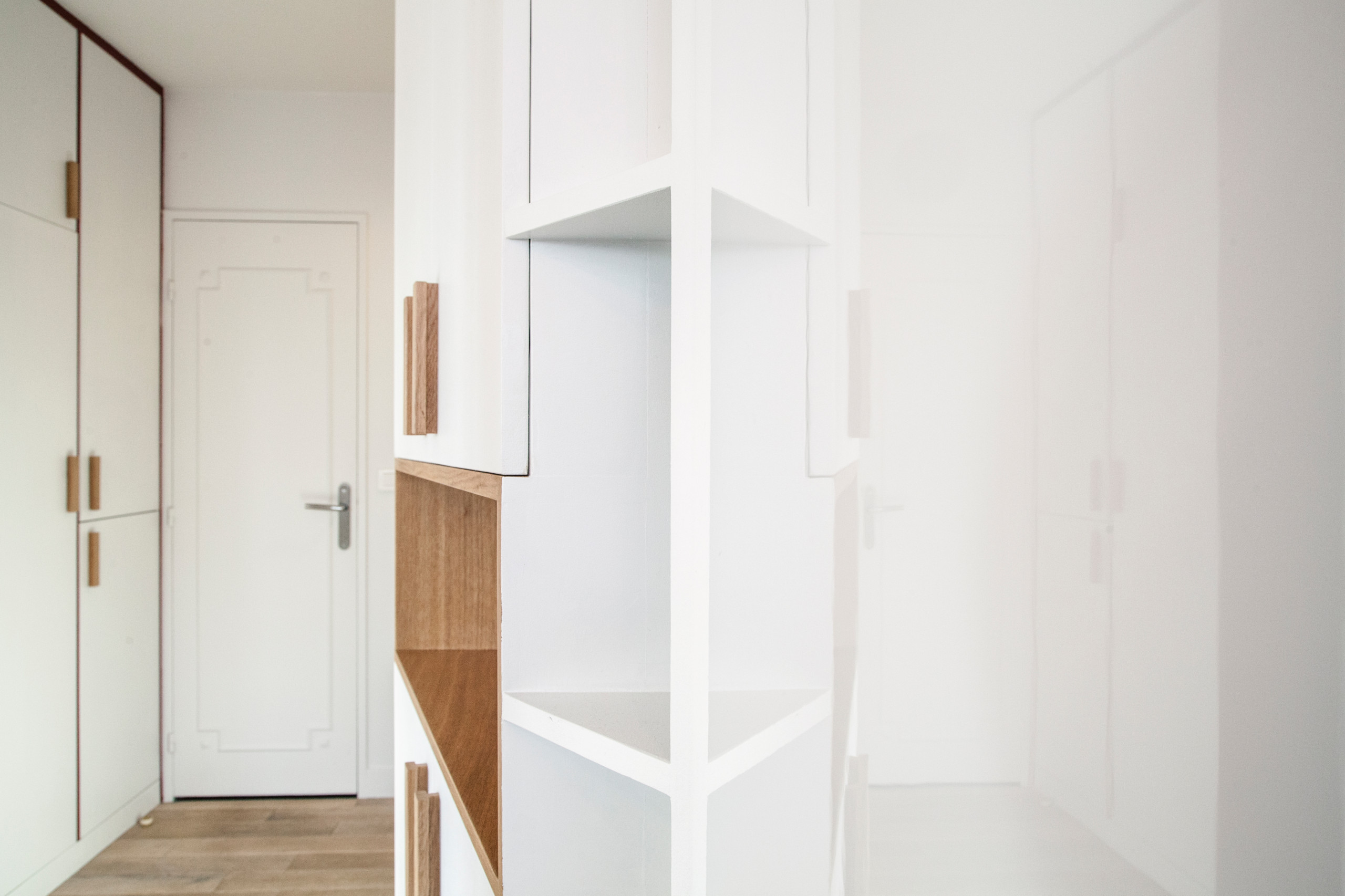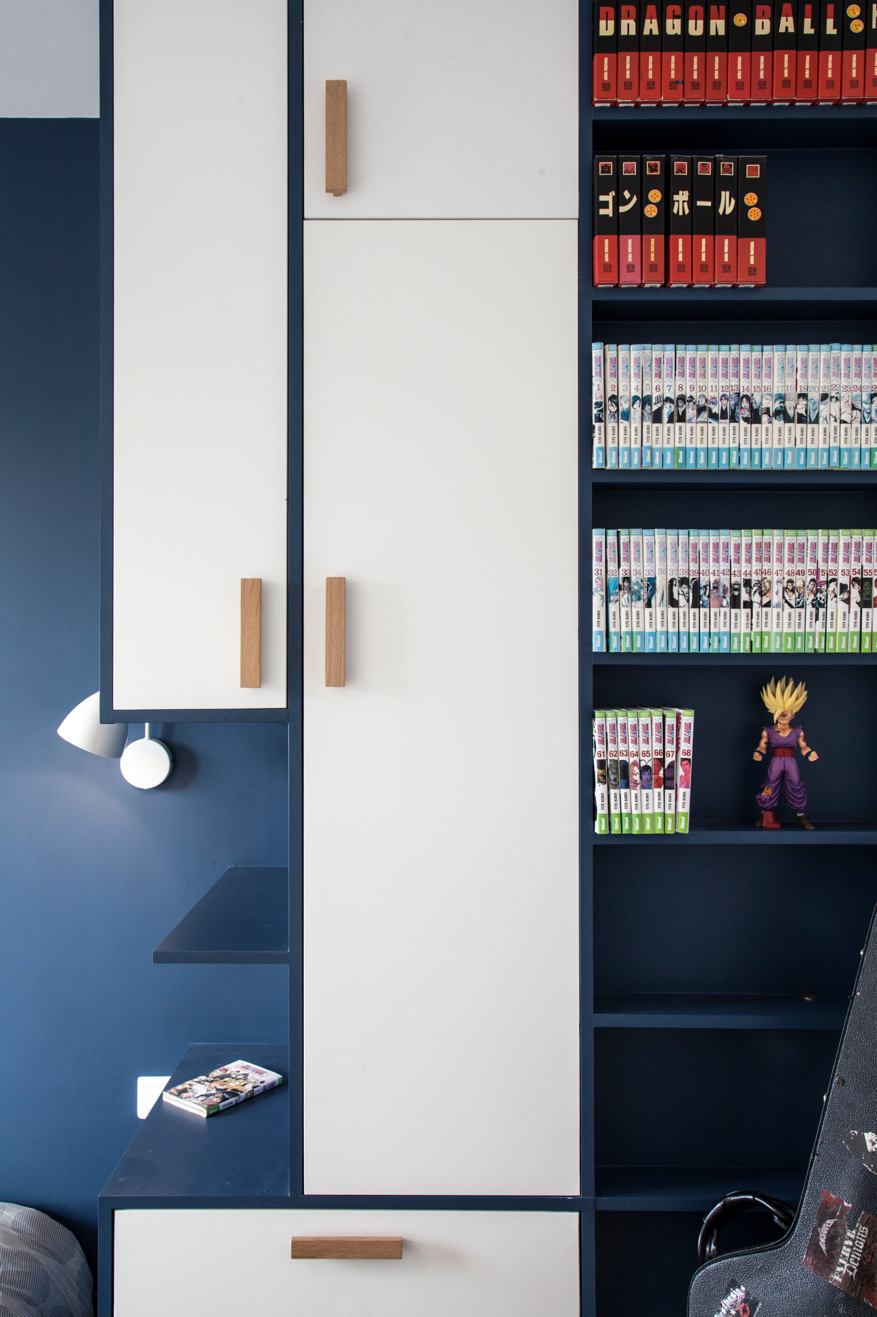 Den Platz rechts neben dem Bett hat Benaim für ein Regal genutzt. Aus Platzmangel sind die Fächer nicht sehr tief – aber tief genug für die Manga-Sammlung des Bewohners. Wie im Rest der Wohnung hat die Architektin auch hier auf Griffe aus Eichenholz gesetzt, um den Möbeln einen individuellen Look zu verleihen.