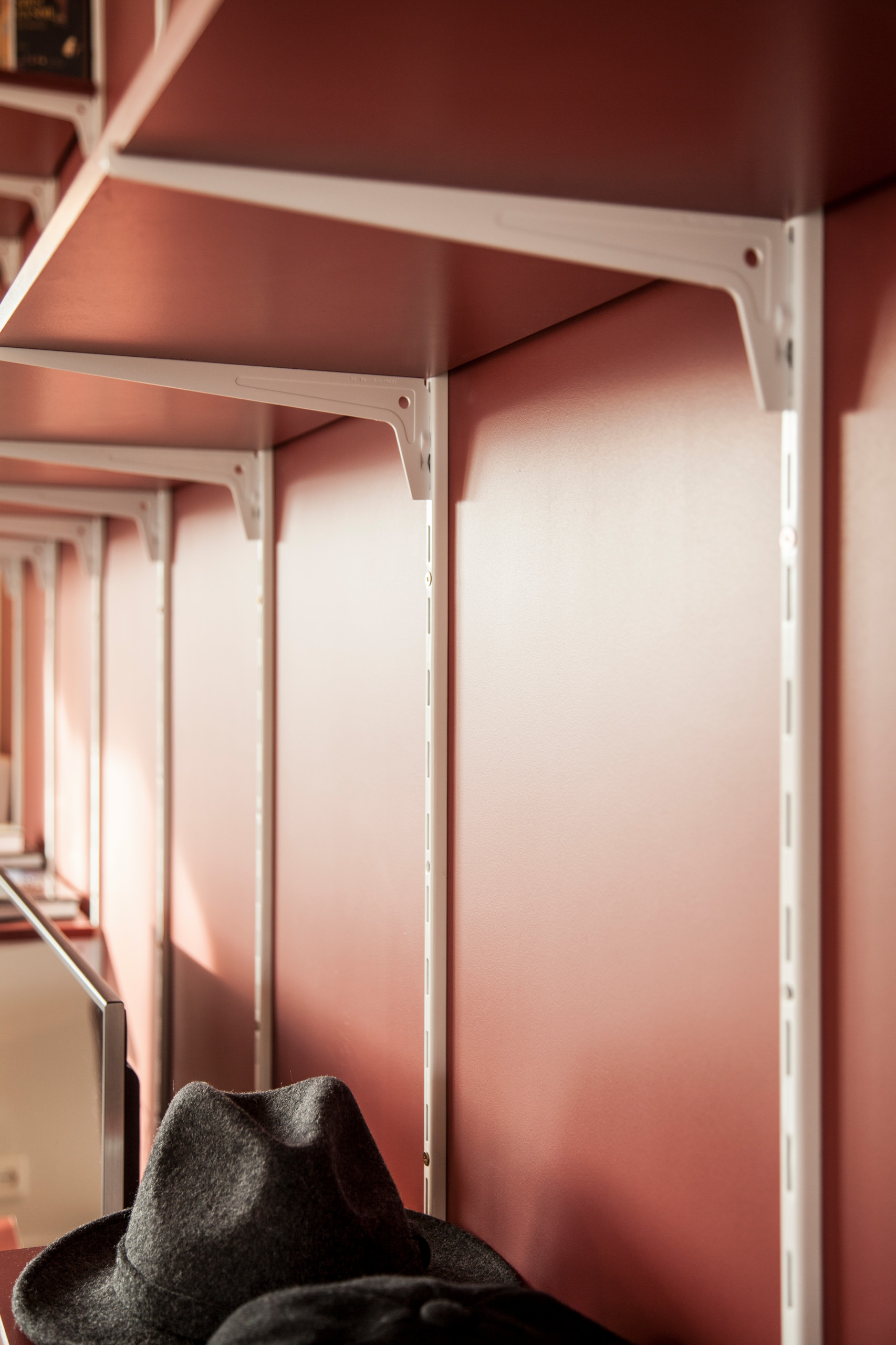 Das Wandregal besteht aus einem System aus Schienen und flexiblen Trägern. „Die Winkel können jederzeit ganz einfach umgesetzt werden, um die Abstände zwischen den einzelnen Fächern oder die Position der Fächer selbst zu verändern, je nachdem, was man ins Regal stellen will“, so Benaim. Außerdem ist die Regalwand ein toller Hingucker. „Und ein sehr gutes Preis-Leistungs-Verhältnis hat das System auch noch.“