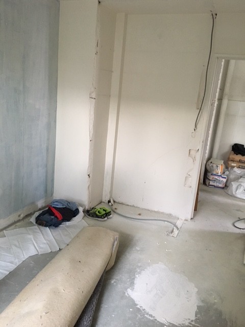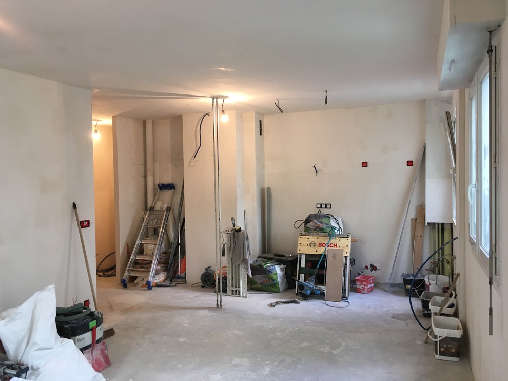 Die größte Baustelle dieses Renovierungsprojektes war das Wohnzimmer. Zuerst wurde die Wand zwischen Wohnzimmer und Küche entfernt, die die beiden Räume ursprünglich voneinander trennte. „Als wir die Wand rausgerissen hatten, kam ein Heizungsrohr zutage, das nun plötzlich mitten im Raum stand, wie auf dem Foto zu sehen“, erinnert sich die Architektin. Was zunächst wie eine kleine Katastrophe wirkte, erwies sich jedoch als echter Glücksfall. „Wir haben einfach eine Holzverkleidung um das Rohr herum gebaut, so dass es sich harmonisch in den Raum einfügt und sogar zum strukturierenden Element wurde.“