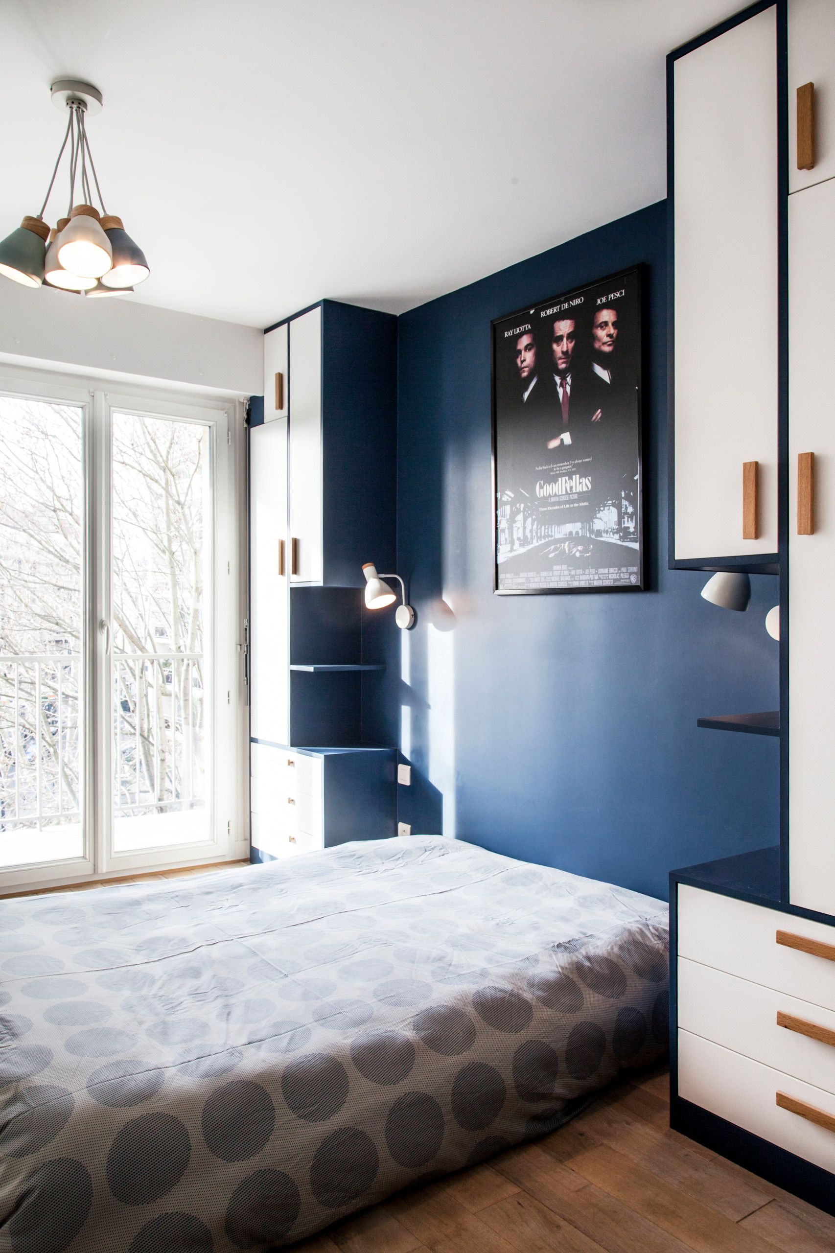 Dank der Terrassentür ist das Zimmer wunderbar hell, so dass die Architektin sich hier an einen kräftigeren Farbton herangewagt hat: Die nachtblaue Akzentwand bildet einen schönen Kontrast zu den weißen Wänden und der Decke – eine Farbkombination, die Benaim im maßgefertigten Schrankelement wiederaufgenommen hat.