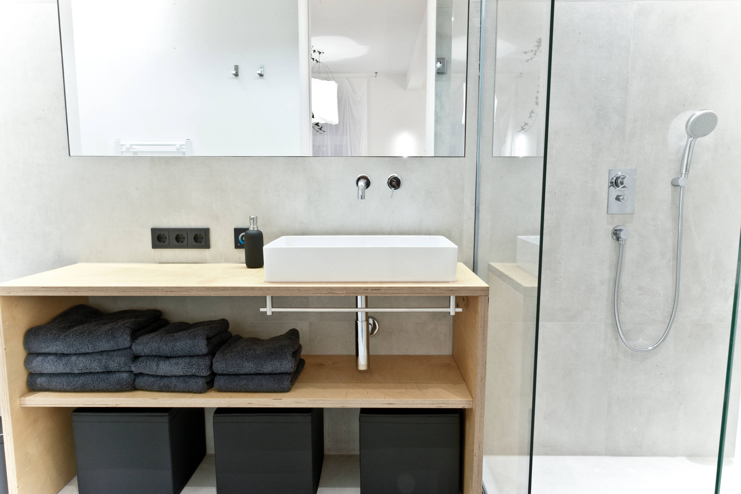 Handtücher, Steckdosen und Aufbewahrungsboxen in Schwarz (von Ikea) verleihen dem Bad noch mehr Coolness.
