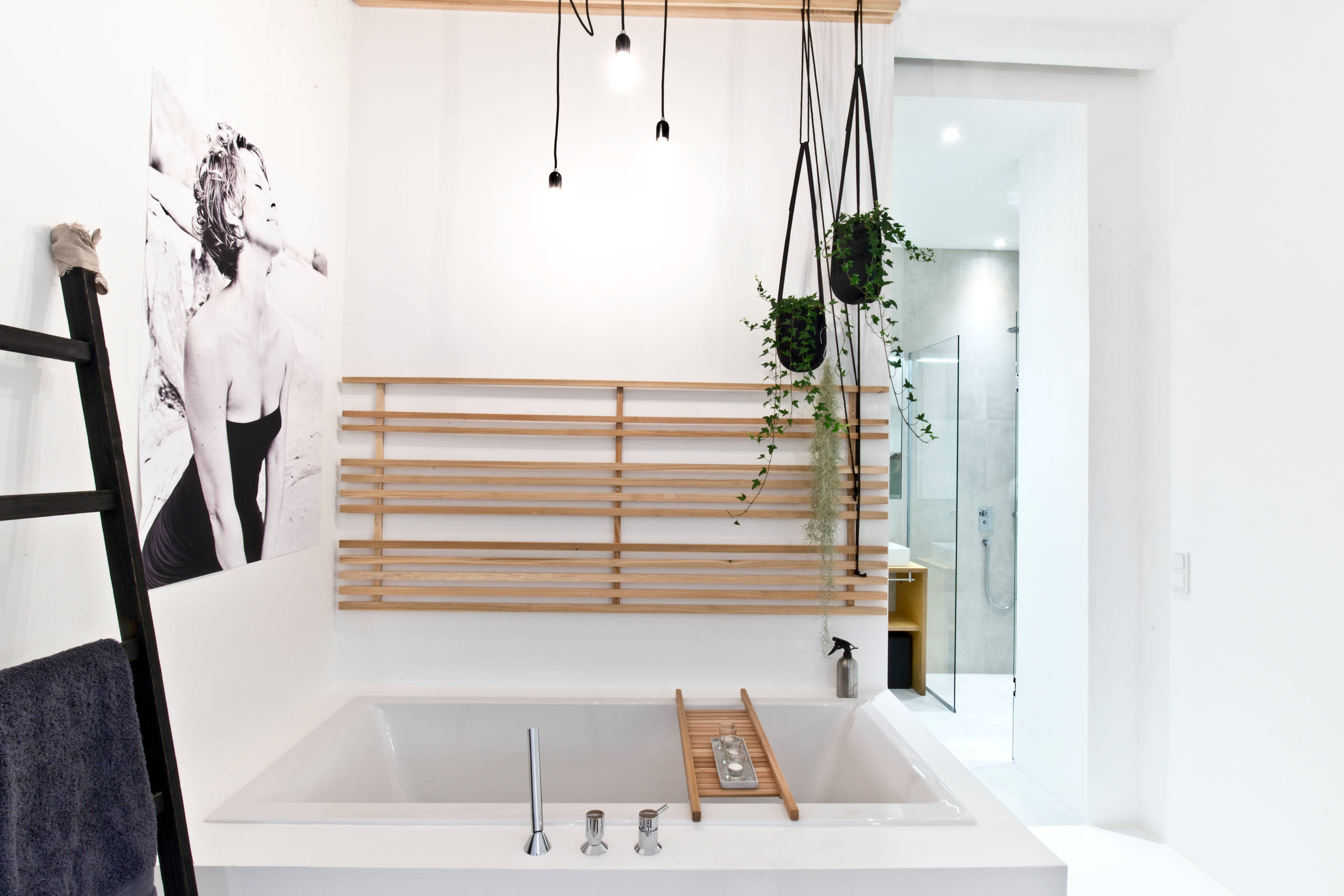 Eine moderne Art der Wandvertäfelung wählte Zola für den umliegenden Bereich der Wanne. „Ich wollte der Ecke einen warmen Charakter verleihen. Eine ganze Holzwand wäre mir zu massiv gewesen“, so Zola. Also hat sie Teile der Wand und Decke mit Lärchenholzleisten aus dem Baumarkt verkleidet. „Die Leisten an der Decke halten zudem die Textilkabel für die Beleuchtung und hängenden Pflanztöpfe.“