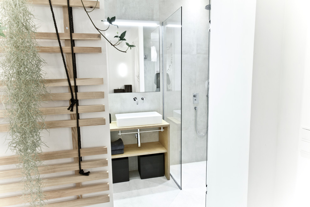 Im neuen Bad hat Zola 120 x 60 Zentimeter große Fliesen im Betonlook an Wänden und Boden verlegen lassen. „Bei so großen Fliesen war es mir auch wichtig, selbst vorzugeben, wo die Fugen hinkommen. Das heißt, ich zeichne den Boden und die Wände maßstabgetreu auf und zeichne jede einzelne Fliese ein. Somit weiß der Fliesenleger, wo er welche Fliese schneiden muss. Eine Fuge an einer falschen Stelle zerstört die gesamte Optik des Raumes“, sagt Zola.
