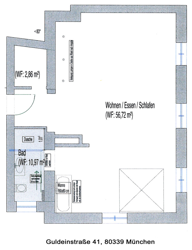 VORHER: Das alte Badezimmer, knapp 11 Quadratmeter groß, hatte nur eine Wanne, keine Dusche. „Ich finde jedoch, dass es beides braucht in einer hochwertigen Wohnung – das Bad ist immer auch Wellnessoase“, sagt Zola. Die Herausforderung war nun Wanne und bodengleiche Dusche unterzubringen, ohne viel Wohnraum zu verlieren. „Hätte ich einfach das vorhandene Bad vergrößert, hätte man eine tragende Wand entfernen müssen, was mit erheblichen Kosten verbunden wäre. Außerdem wäre damit auch das Loft optisch kleiner geworden“, so die Interior Designerin.