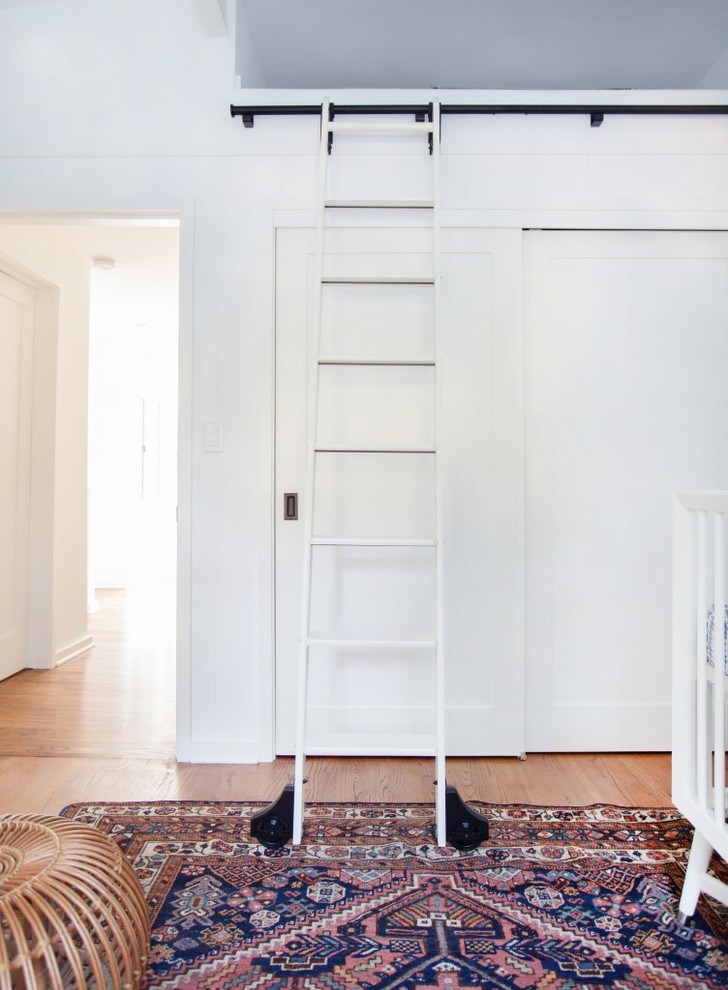 Die Interior-Designerin hat wirklich das Maximum aus dem kleinen Raum herausgeholt. Als besonderes Highlight gibt es noch eine Zwischenetage über dem Schrank. Die kann der Sohn zwar erst nutzen, wenn er größer ist, aber bis dahin kann er an der Leiter seine Kletterfähigkeiten erproben – natürlich nur unter Aufsicht. Bei Bedarf lässt sich die Leiter auch ganz wegräumen, damit mehr Platz zum Krabbeln auf dem Boden bleibt.