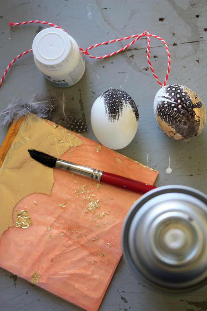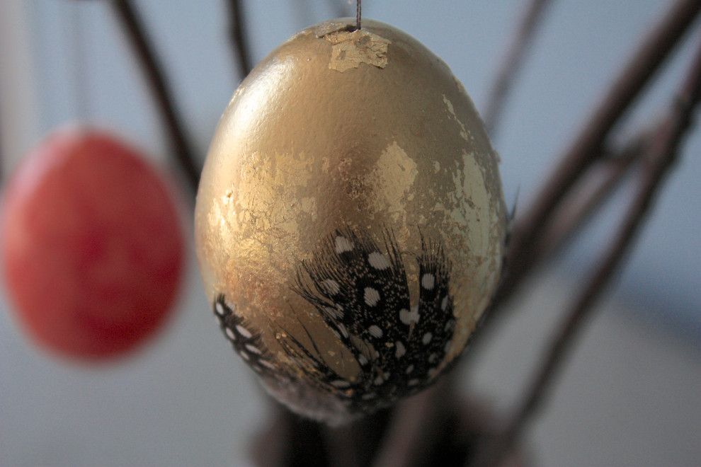 Eine Variante der Federdekoration für alle, die es goldiger mögen: Vor Aufbringen der Federn das Ei einmal komplett mit Goldlack besprühen (am besten, während es auf einem Schaschlickspieß-Ständer steht). Aber Achtung: Aus ausreichendem Abstand sprühen, sonst entstehen Tropfnasen.