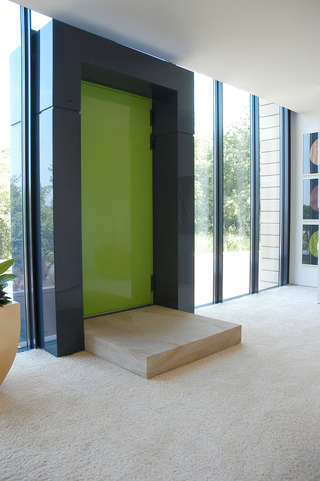 ► Diese Haustüre aus einem Projekt von Reis Möbelsysteme wurde mit grünem Corian beschichtet. Die Corian-Farbpalette umfasst mittlerweile 100 verschiedene Farben. Auch individuelle Sondertöne können angefertigt werden. Wobei das Corianmaterial komplett durchgefärbt ist.