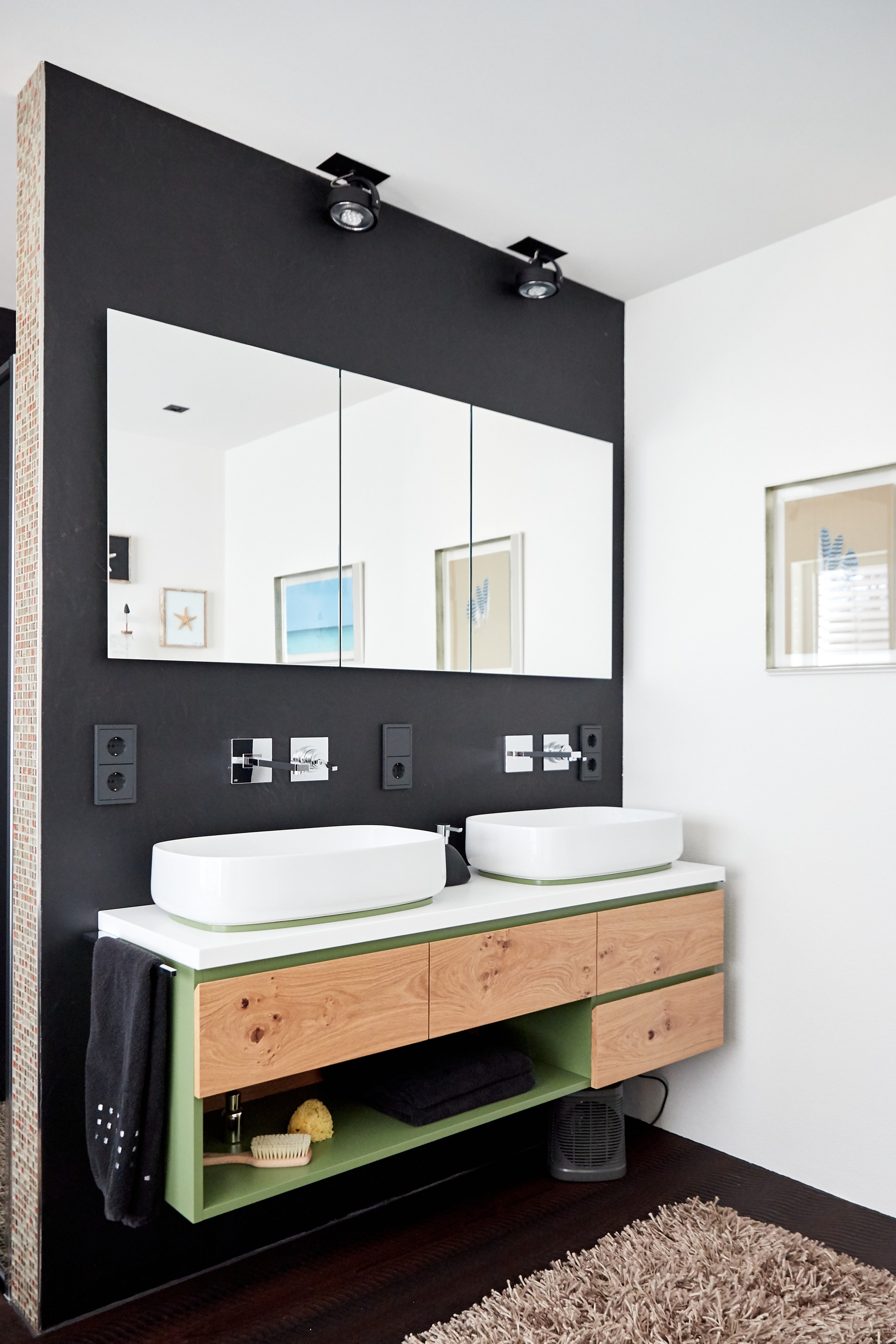 Ein gelungener Mix aus grünem Korpus, Eichefronten und einer Waschtischplatte aus schneeweißem Corian in einem Bad von Schmalzgruber Möbelmanufaktur.
