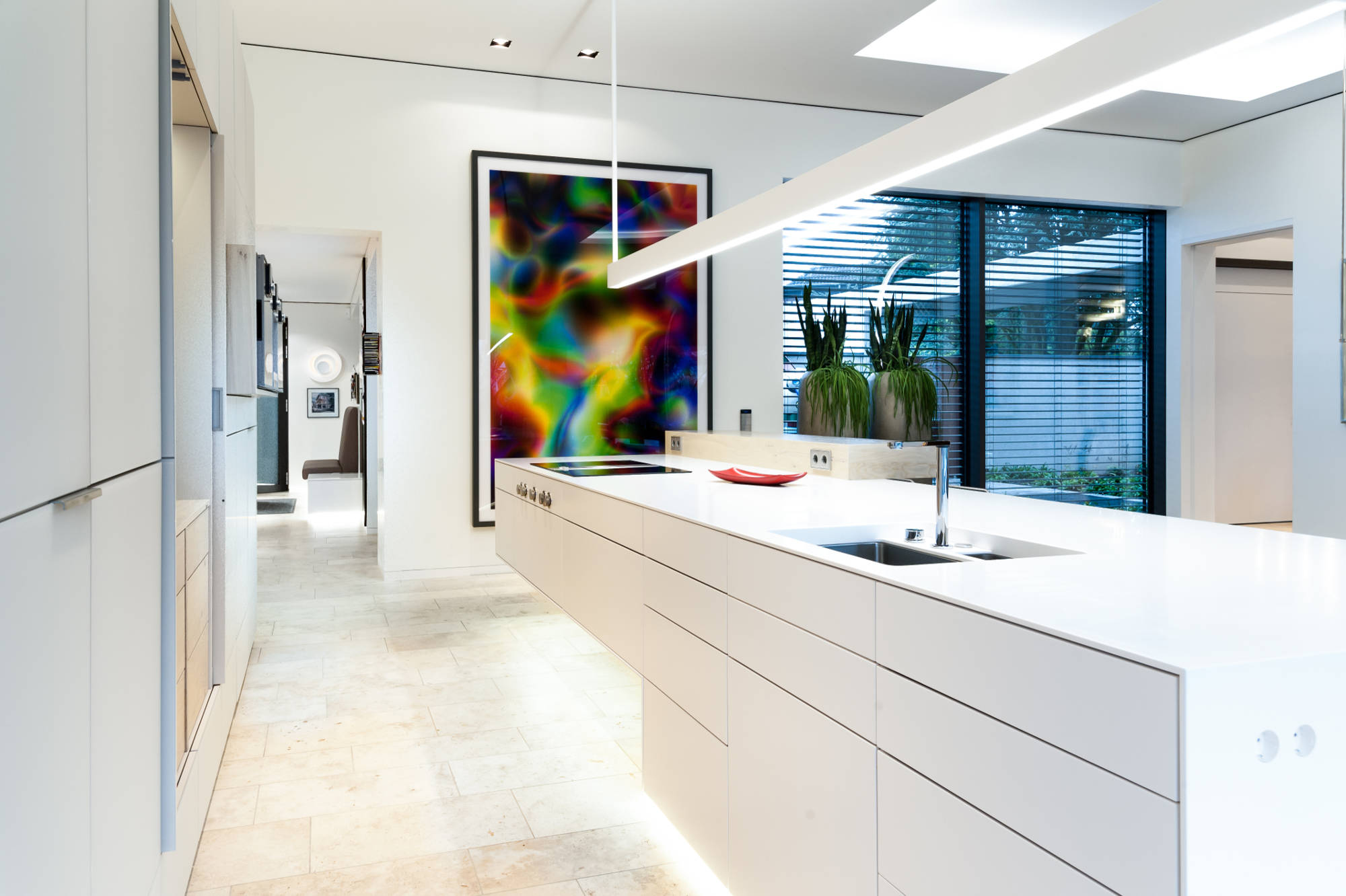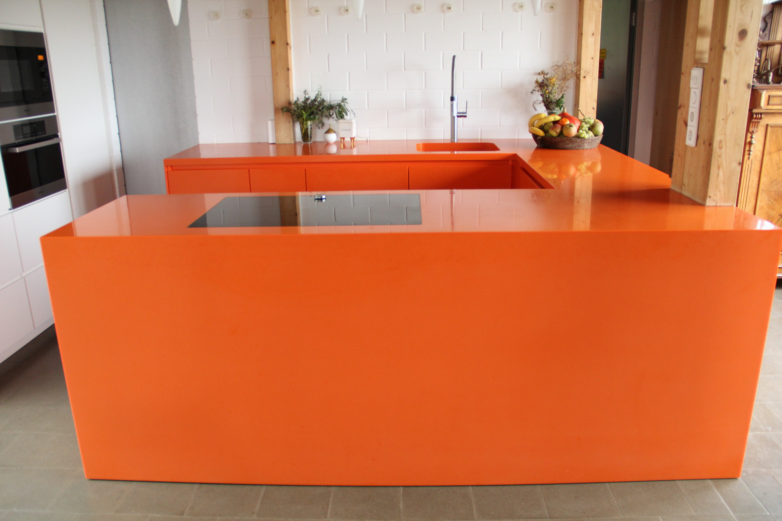 Eine etwas weniger bekannte Corian-Alternative mit nahezu identischen Eigenschaften ist übrigens der Verbundwerkstoff „Hi-Macs“ von LG Hausys. Beer Küchen haben daraus gleich einen kompletten Küchenblock in leuchtendem Orange angefertigt.