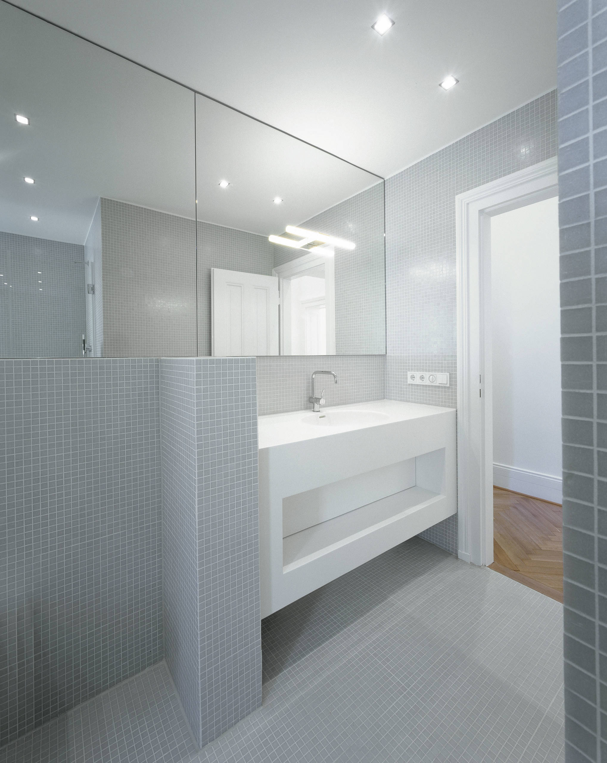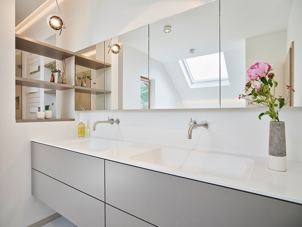 Das Doppelwaschbecken aus Corian verklebte das Team von HONEYandSPICE bündig mit der Waschtischplatte und dem Spritzschutz, der ebenfalls aus Corian besteht und bis zur Unterkante des Spiegelschranks reicht.
