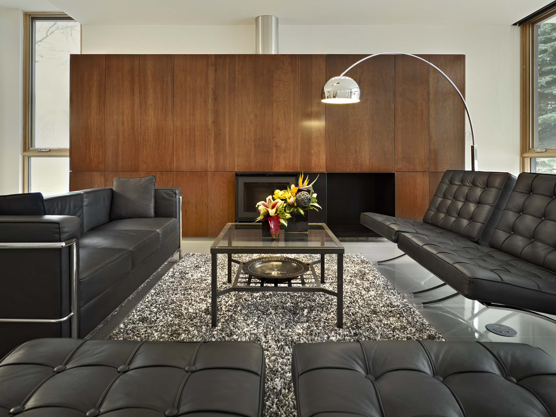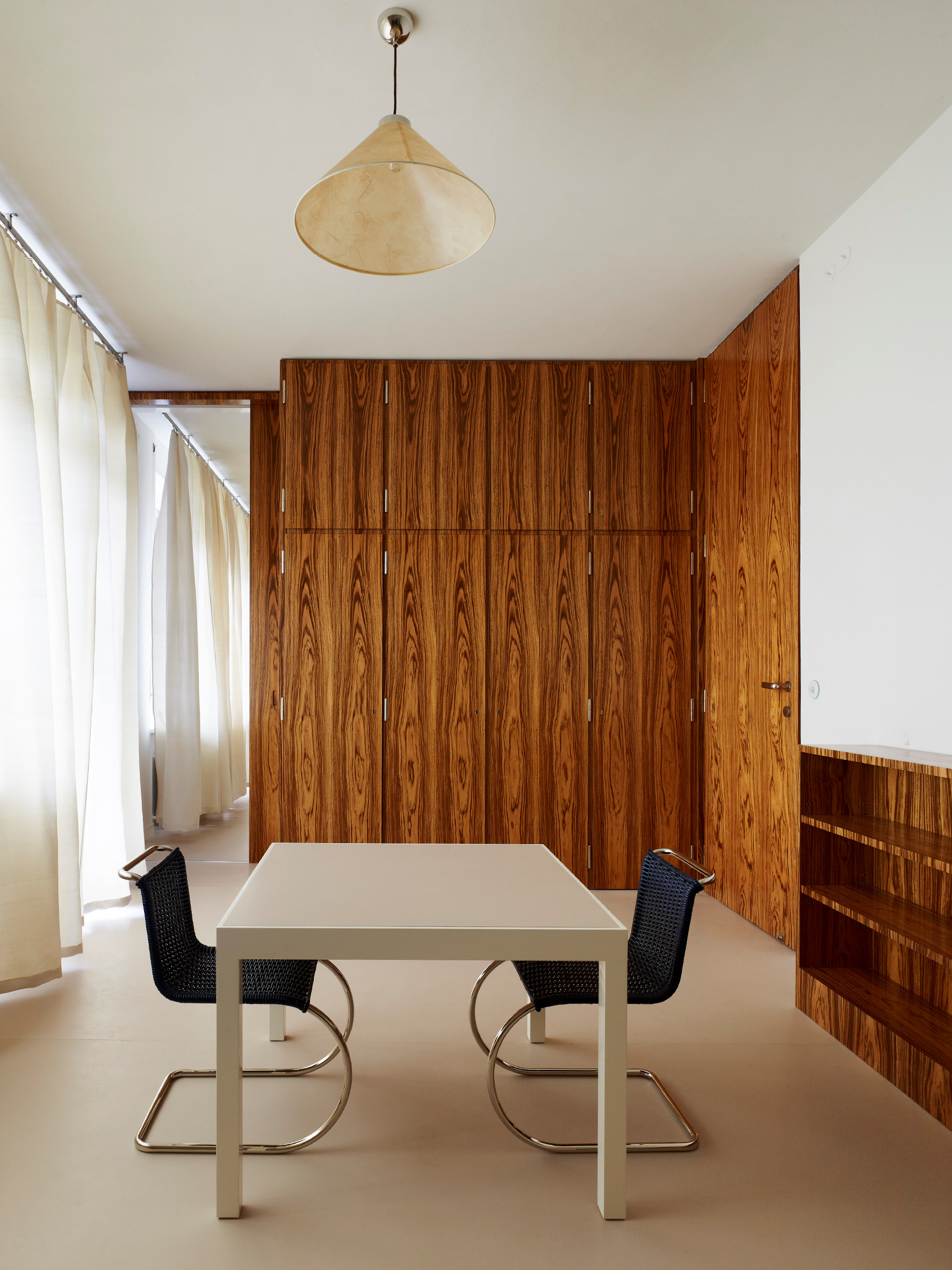 Das ist mal ein Raum in echtem Bauhauslook. Die verkleidete Schrankwand in Nussbaum, dazu die „Barcelona Chairs” (Mies van der Rohe) und die „LC3”-Couch von Le Corbusier. Fliesenboden und Chrom-Leuchte bringen den Raum zudem absolut auf Hochglanz!