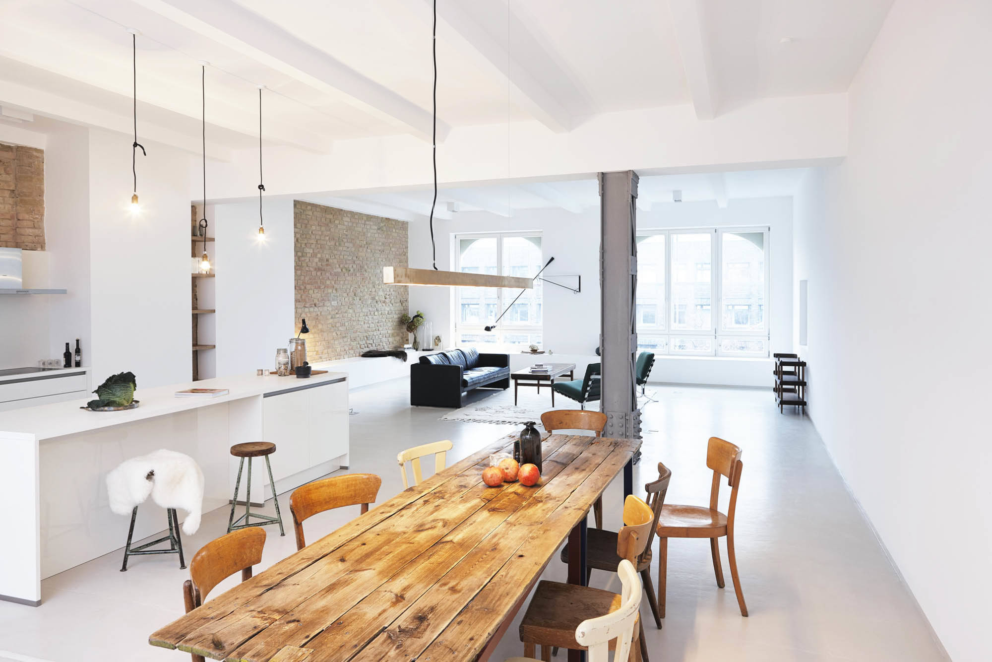 Sie denken jetzt an kalte Füße auf hartem Betonboden? Nicht unbedingt: Eine Fußbodenheizung lässt sich auch im Estrichboden integrieren. Mit großen Orientteppichen können Sie den Industrie-Stil bewusst brechen – stellen Sie am besten einen Eisentisch mit Patina darauf, um den Bogen zum roughen Look wieder zu spannen.