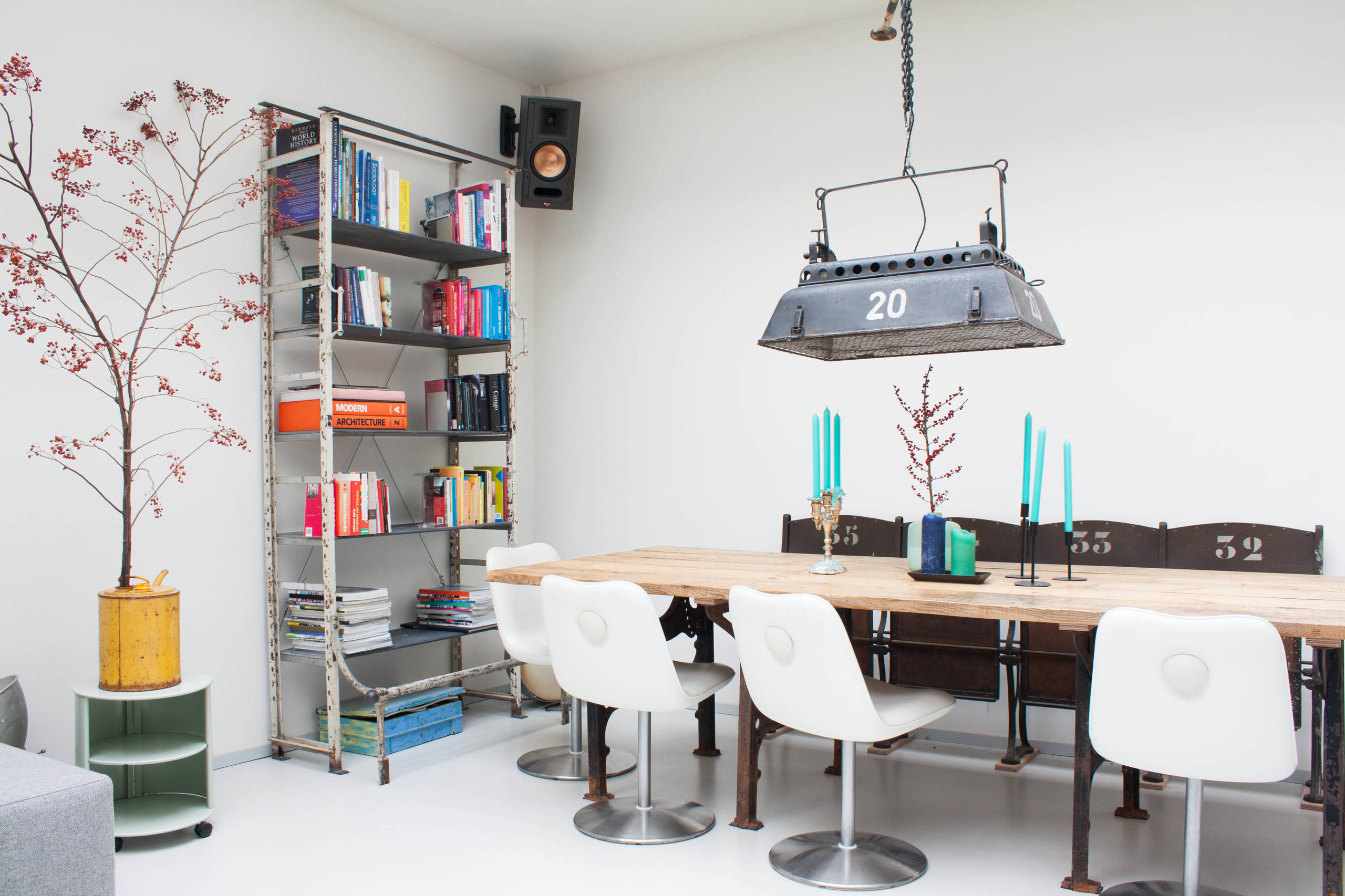 Denken Sie an Werkshallen und die Farben die Sie dort finden – zum Beispiel Industriegrün oder Feuermelderrot! Farben mit hoher Sättigung können gut als Akzente eingesetzt werden, wie diese Hocker von Tolix, die, wiederum aus Metall, perfekt zum Stil passen.