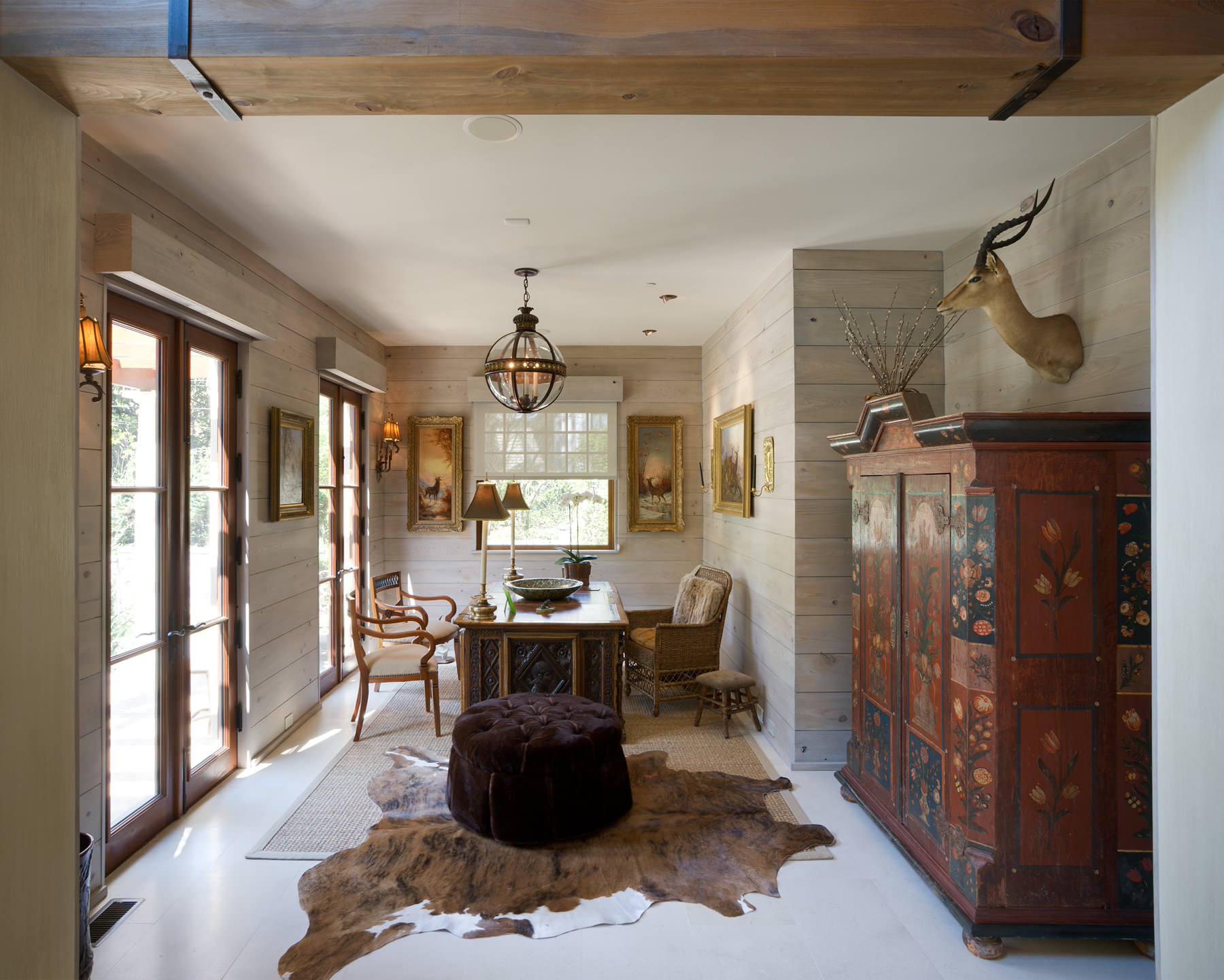 Kuhfell als Teppich, Pouf aus Schaffell, dazu alte Bauernmöbel, ein massiver Holztisch und nicht zuletzt die offenen Deckenbalken – dieser Raum ist absolut rustikal!