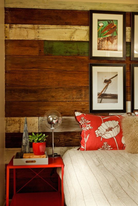 Kein blasser, sondern ein grüner Schimmer ist hier auf die Wandvertäfelung aus Altholz gezaubert worden. Gemeinsam mit dem roten Nachttisch ein echter Eyecatcher. Das Rot und Grün wurde jeweils in den Wohnaccessoires wieder aufgegriffen und peppt so den rustikalen Stil des Raumes wunderbar auf.