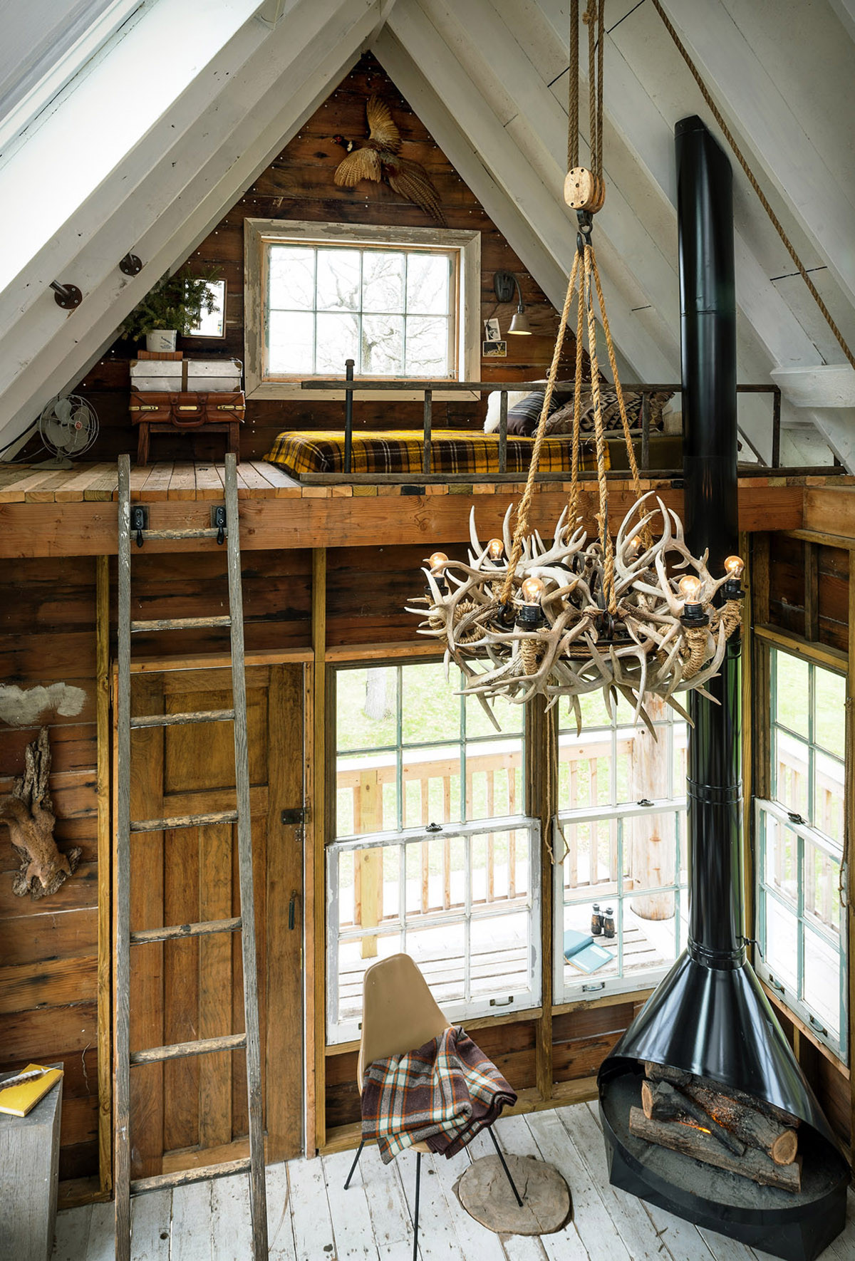 Ein Mittagsschlaf auf dem Sofa mit Schaffell-Bezug muss unfassbar gemütlich sein. Das Brennholz, das unter der Ablage aufgebeugt wurde, wirkt schon beinahe wie eine Installation; die Deckenleuchte aus Korbgeflecht und die süßen Geweihe (ganz tierfreundlich aus Ton und Ästen!) zaubern Leichtigkeit.