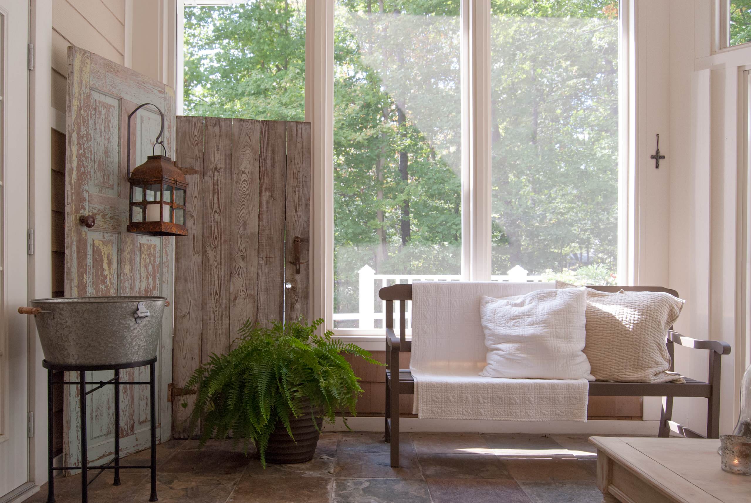 Altes Metall trifft auf Scheunen-Look und eine massive Holzbank. Die bodentiefen Fenster lassen viel Licht herein und geben so dem rustikalen Look einen modernen Touch. Wow!