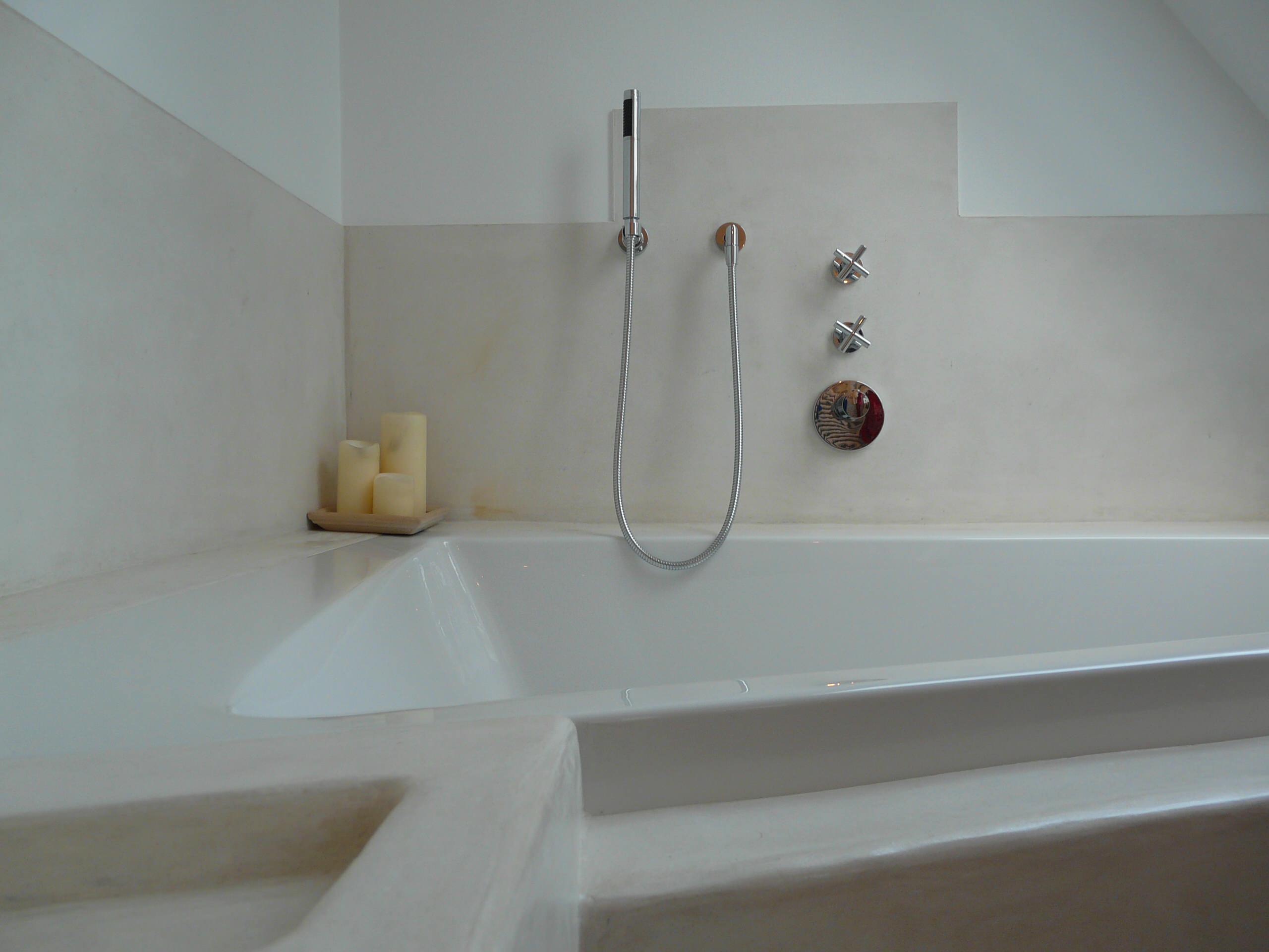 So lassen sich auf einem passend geformten Untergrund, beispielsweise aus Gasbetonsteinen, runde Waschbecken, eckige Dusch- oder ovale Badewannen mit Tadelakt versehen. Der Kreativität sind kaum Grenzen gesetzt.