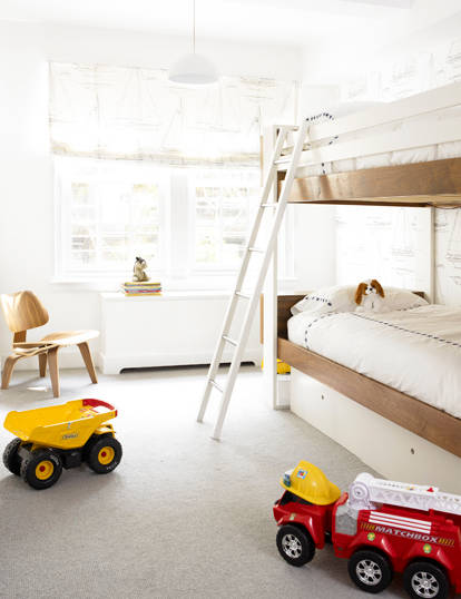 Stauraum ist da, wo man ihn braucht: In den untersten Stufen der Treppe befinden sich geräumige Schubladen, die Kleider im Nu verschwinden lassen; in den halbtransparenten Kisten in der Spielecke unter dem Bett findet sich schnell das passende Spielzeug.