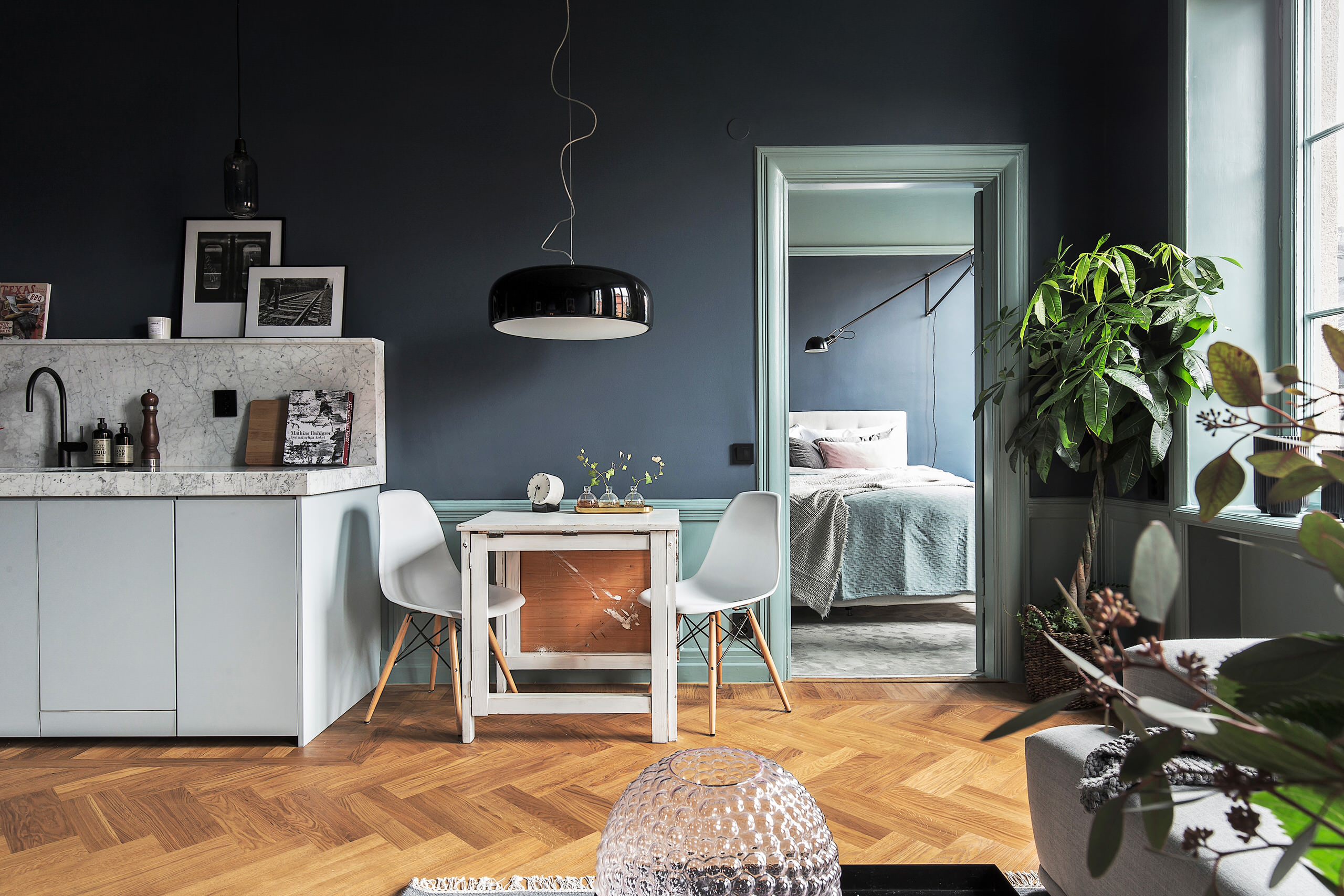 „Skandinavischer Stil“ – bei diesem Stichwort denken wir in der Regel an helle Räume und klare Linien. Die letzte Folge des Skandinavien-Krimis kommt uns in den Sinn, wir erinnern uns an den Ikea-Katalog und Produkte in „nordischem“ Design – also clean, grau, weiß. Aber in den vergangenen Jahren haben sich bunte, ja sogar dunkle Wandfarben die skandinavischen Wohnungen und Fotoshootings erobert. Die Wände in den Ländern des Nordens scheinen eine lange Durststrecke hinter sich zu haben, so begierig haben sie die neuen Farbtöne in Grau, Blau, Grün und Rosa aufgesaugt. Warum werden die neuen Farben in Skandinavien so stürmisch begrüßt, und wie setzt man sie dort ein? Wir haben uns Trendstudien und -prognosen angeschaut – und nehmen den Einzug der Farben in die Wohnräume Nordeuropas unter die Lupe.