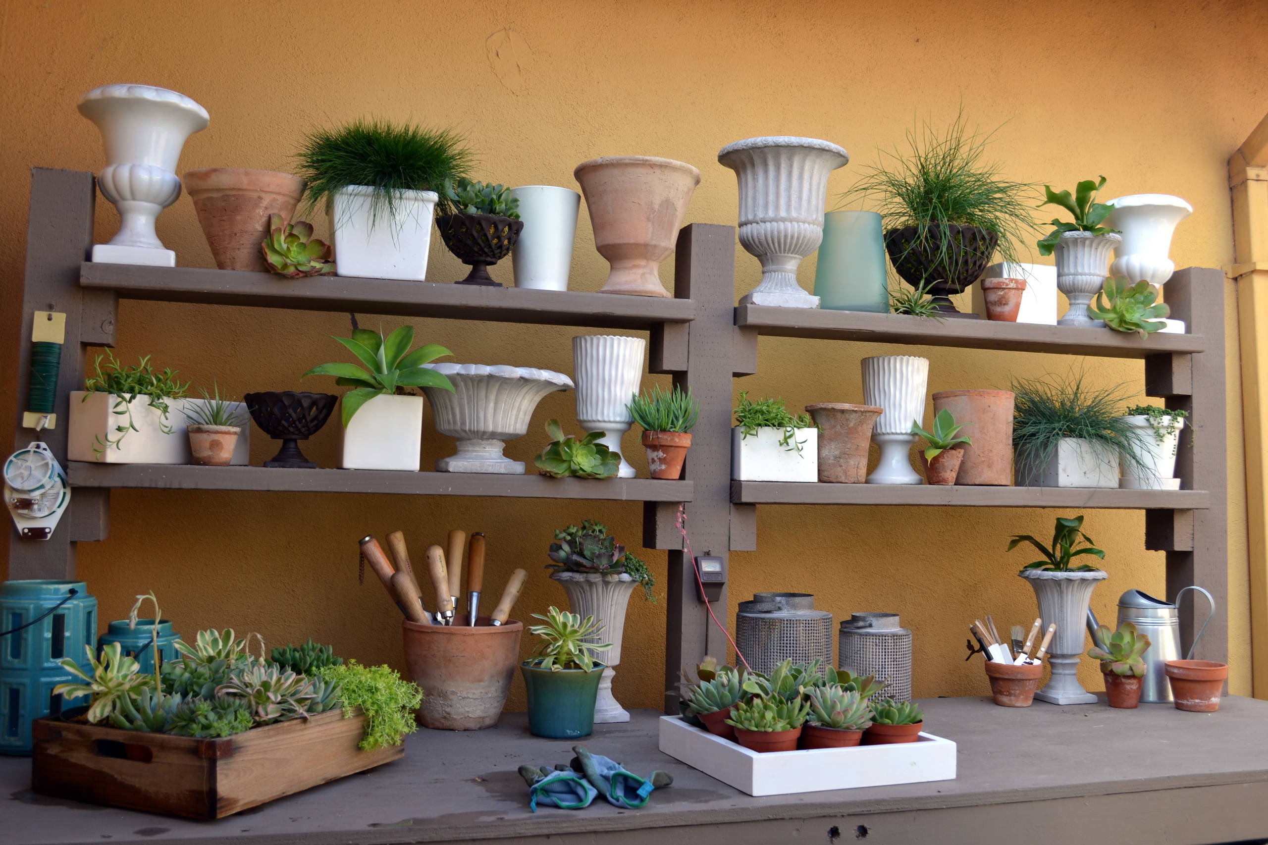 Richtig einladend sieht dieser fröhliche Pflanztisch in San Francisco aus. Nicht nur Blumentöpfe sondern auch Windlichter und Dekoartikel für den Garten werden hier aufbewahrt. So werkelt man doch gern!