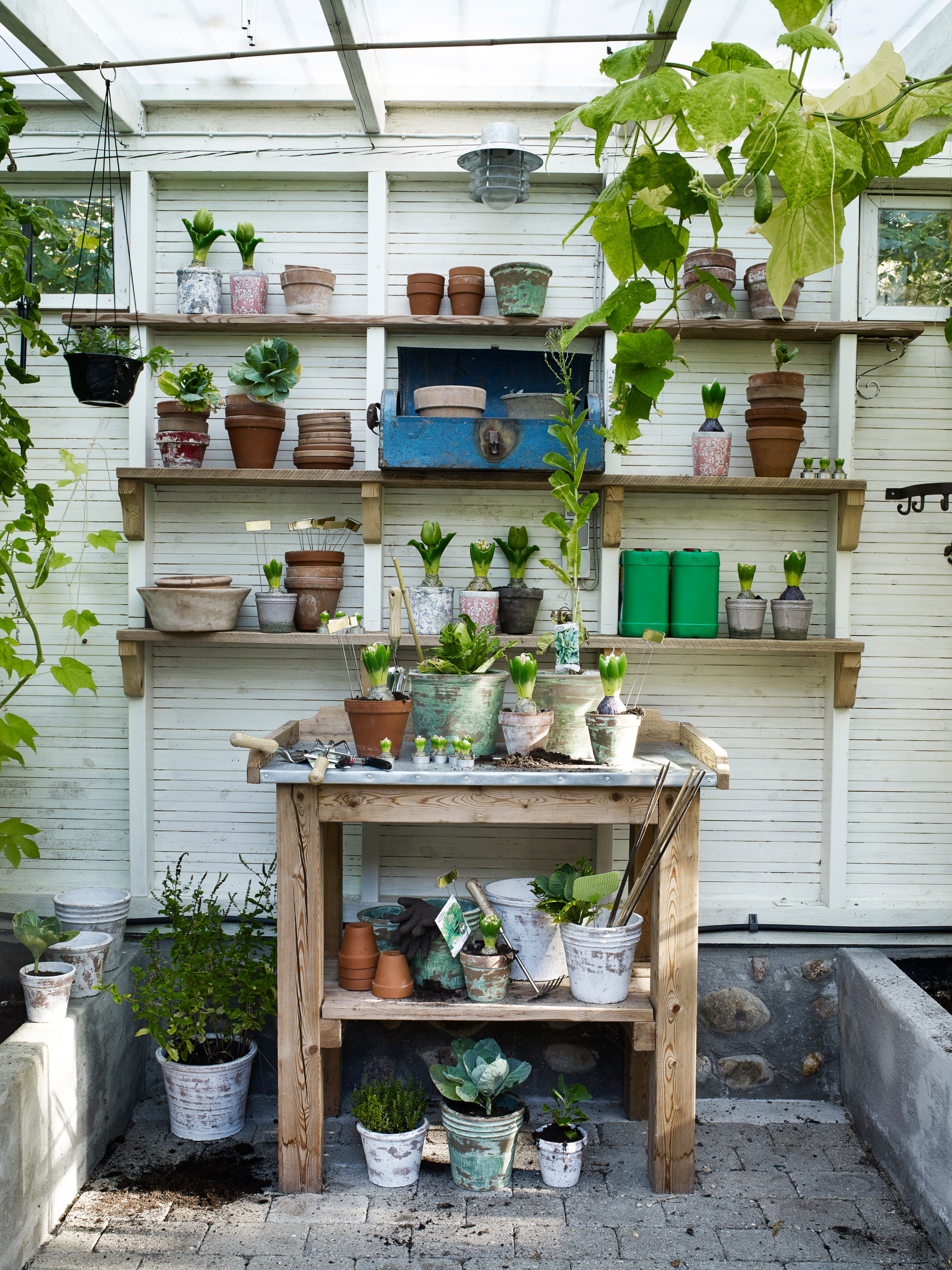 Geschützt vor Wind, Regen und Sonne werkeln die Besitzer dieses hellen Schuppens in Boston. Besonders gut macht sich ein Pflanztisch auch in Gewächshäusern. Wenn dann draußen der Sommerregen niederprasselt, ist es drinnen umso heimeliger.