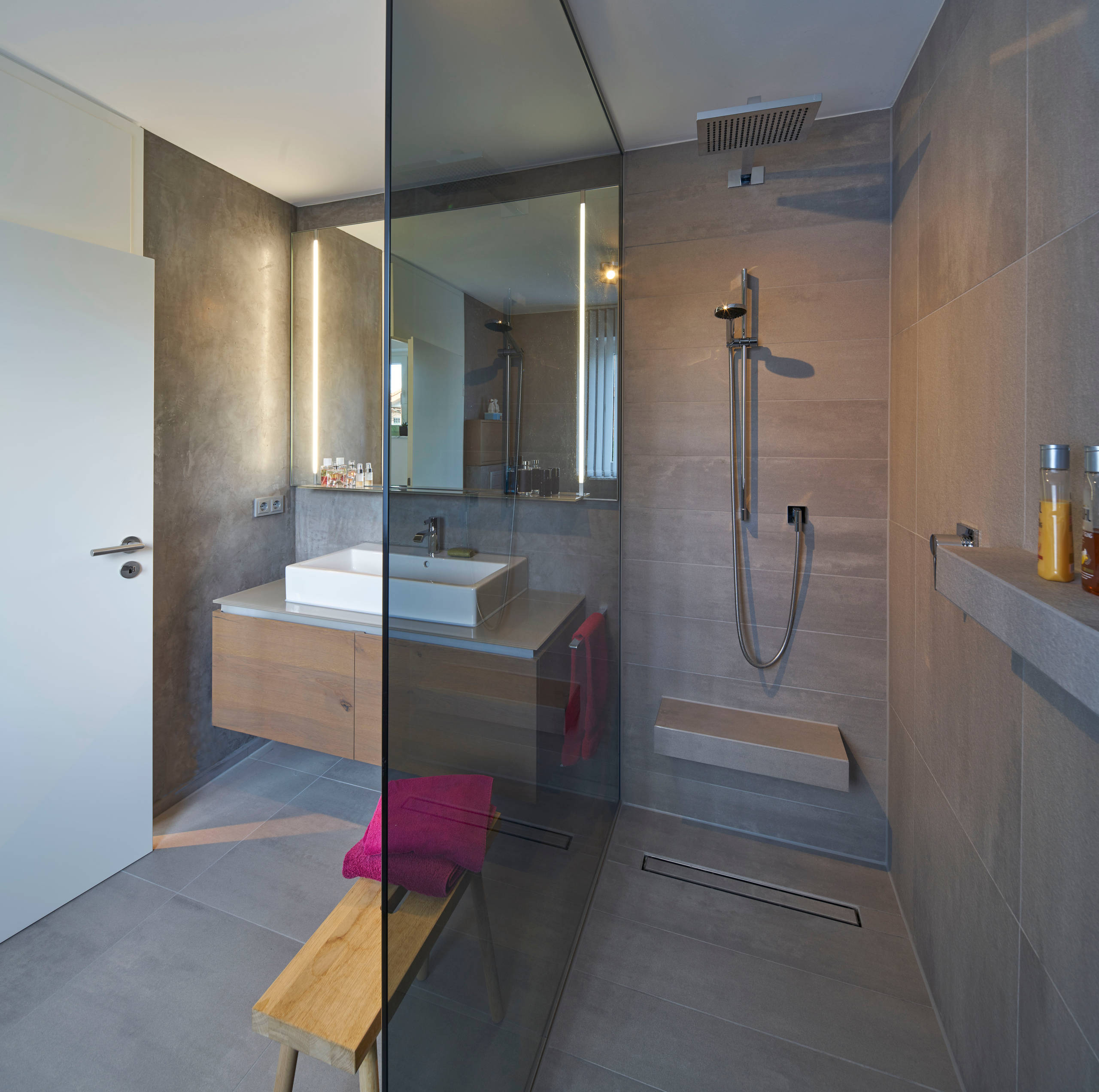 Ein Bad mit Sumpfkalk-Oberflächen gestaltet von Marcus Spohn. Diese Art der fugenlosen Badgestaltung ist nicht nur minimalistisch und pflegeleicht, sondern kommt komplett ohne Silikonfugen aus.