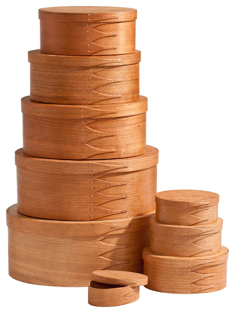 Auch bei den Shakern wurde nicht auf Accessoires verzichtet. Die sogenannten „oval boxes“ gibt es in verschiedenen Größen. Sie dienten zur Aufbewahrung aller möglichen Dinge, wie etwa Nähzeug. Ihr Design aus Spanholz ist schlicht, charakteristisch sind die „Schwalbenschwänze”. Das Bugholzverfahren, mit dem die ovale Form hergestellt werden konnte, haben sich die Shaker übrigens vom bekannten Tischlermeister Michael Thonet abgeschaut.