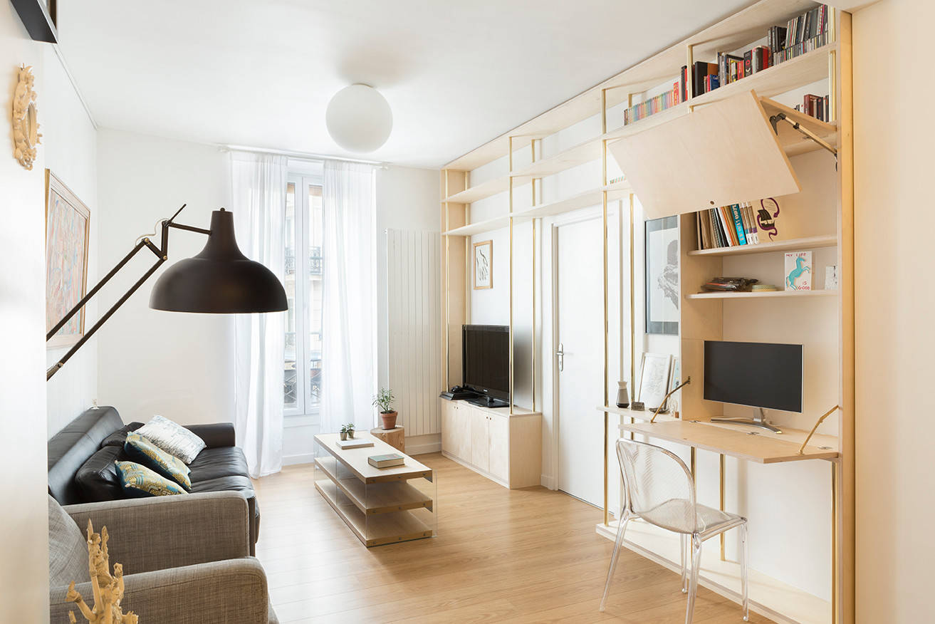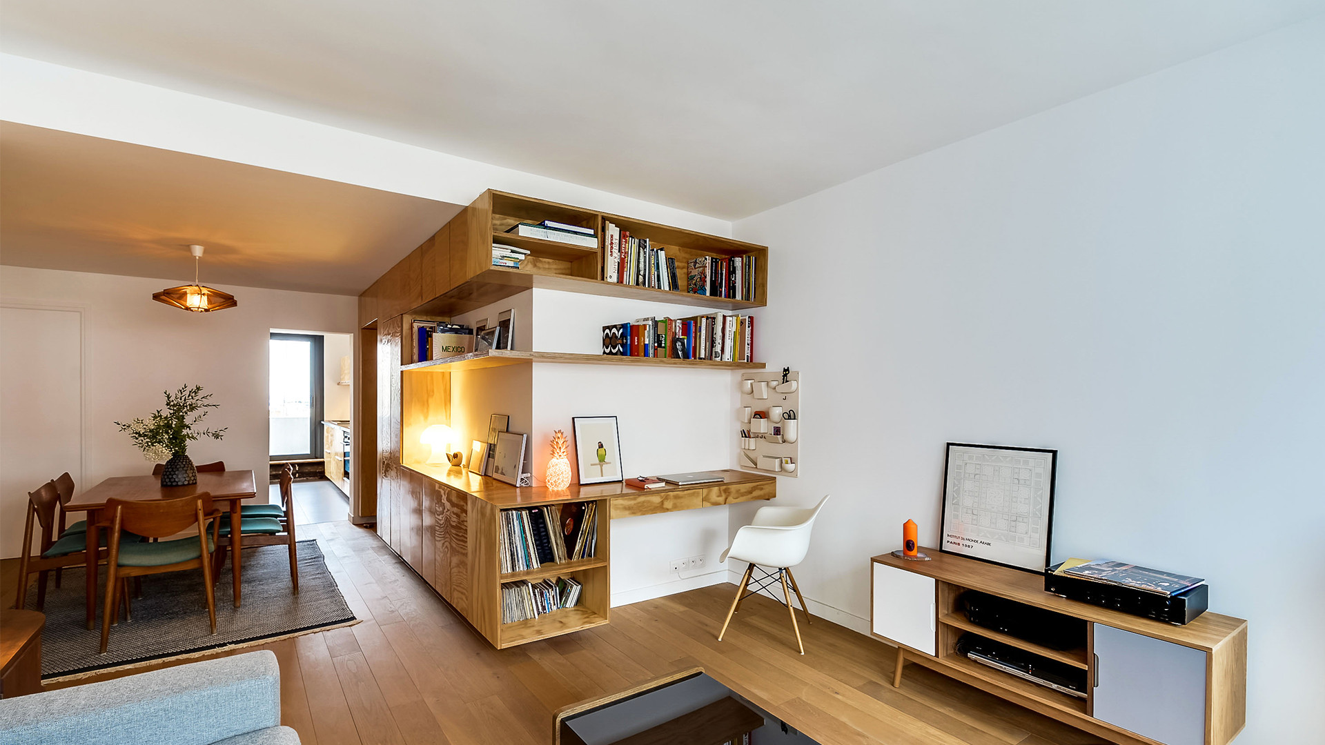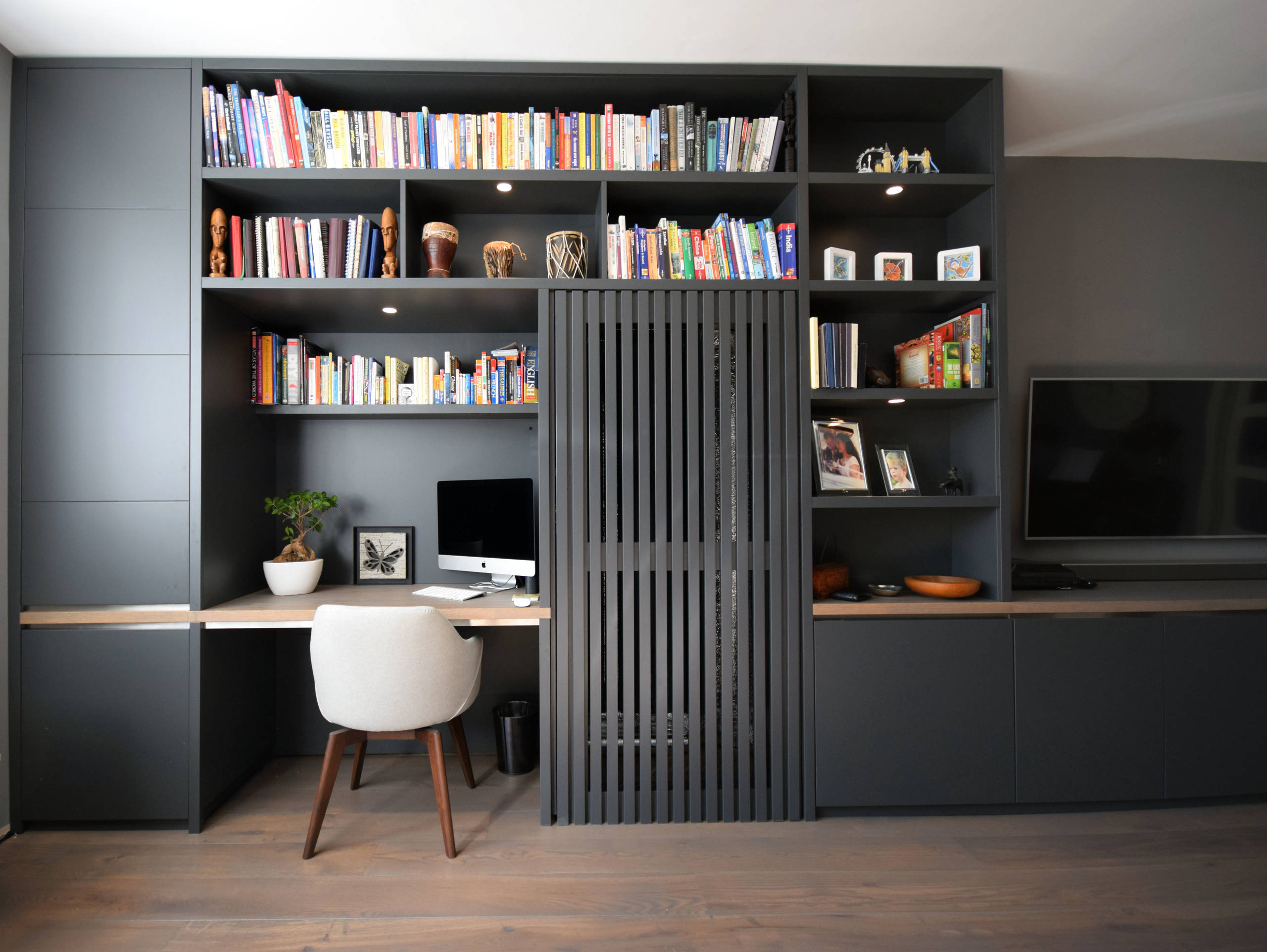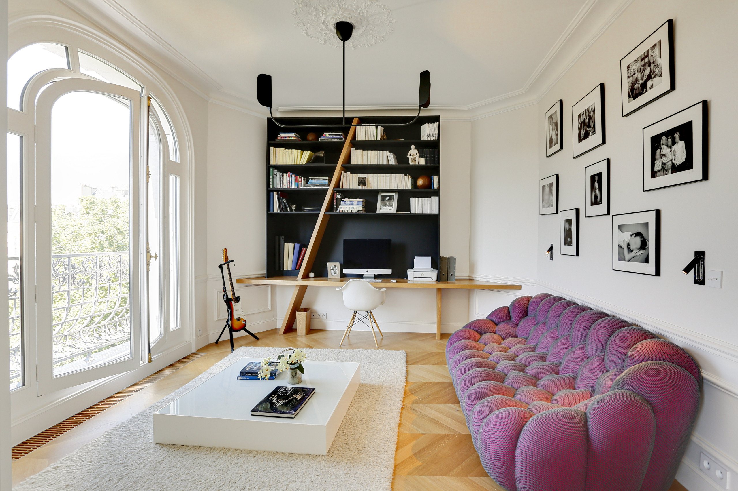 1. Schräg. Bei der Renovierung einer Altbau-Wohnung in Paris sollte auch eine Bibliothek samt Arbeitsplatz einziehen. Beides wurde in einer Nische des Wohnzimmers eingepasst. Dynamisches Detail: Eine Leiste zieht sich vom Schreibtisch quer durchs Regal und verleiht dem Arbeitsplatz Charakter. Der Schreiner Ihres Vertrauens kann Ihnen eine ähnliche Lösung planen.