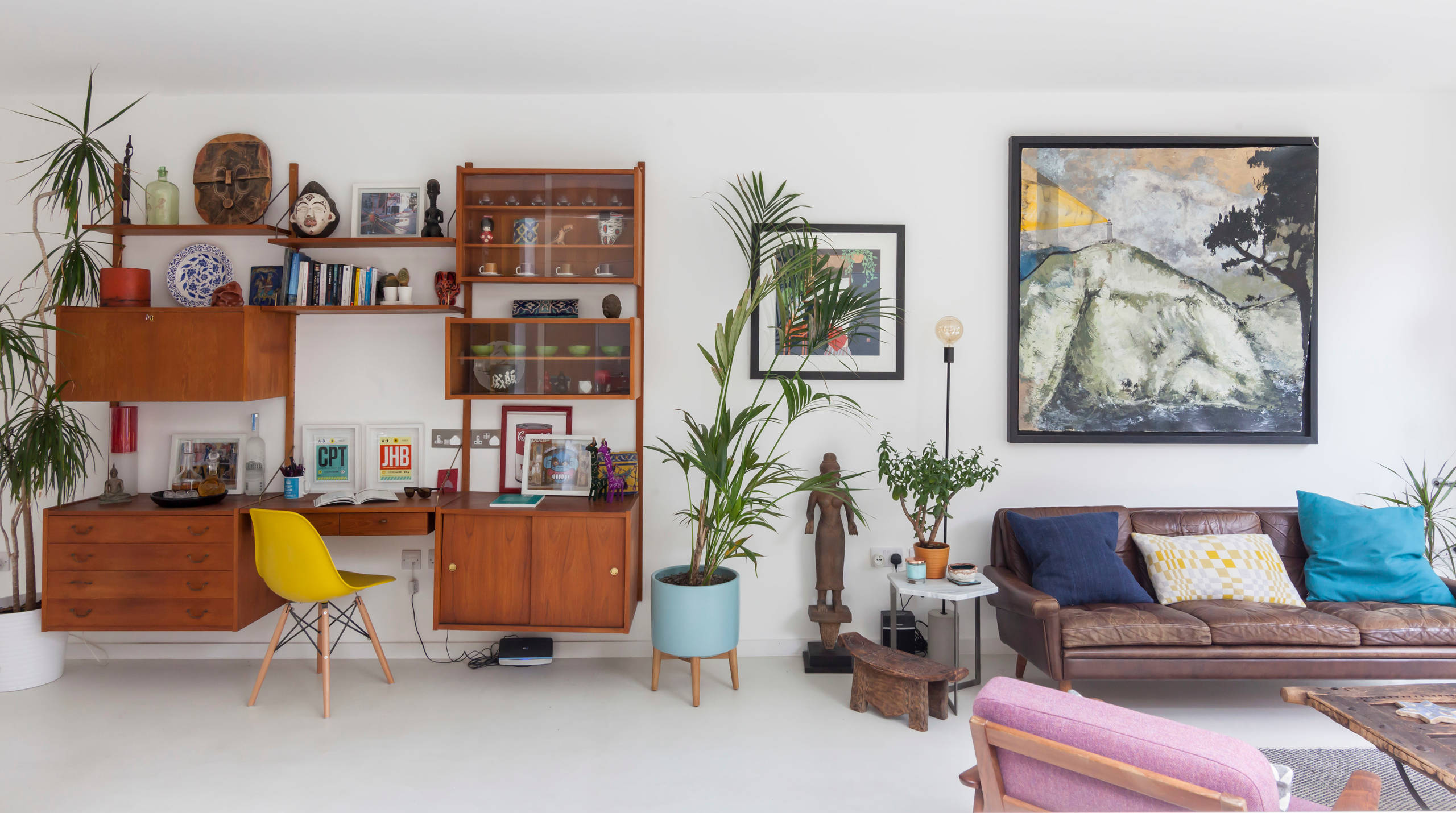 3. Mit System. Bücherregale aus Teak wie in diesem Londoner Zuhause bieten neben Regalen und Schrankelementen oft auch einen Arbeitsplatz (je nach Konfiguration). Vintage-Stücke finden Sie in Online-Shops, Internet-Marktplätzen oder Antik-Läden, die sich auf Mid-Century-Möbel spezialisiert haben. Die Firmen String und Vitsoe (System 606 von Dieter Rams) haben ähnliche Regalsysteme nach wie vor im Programm.