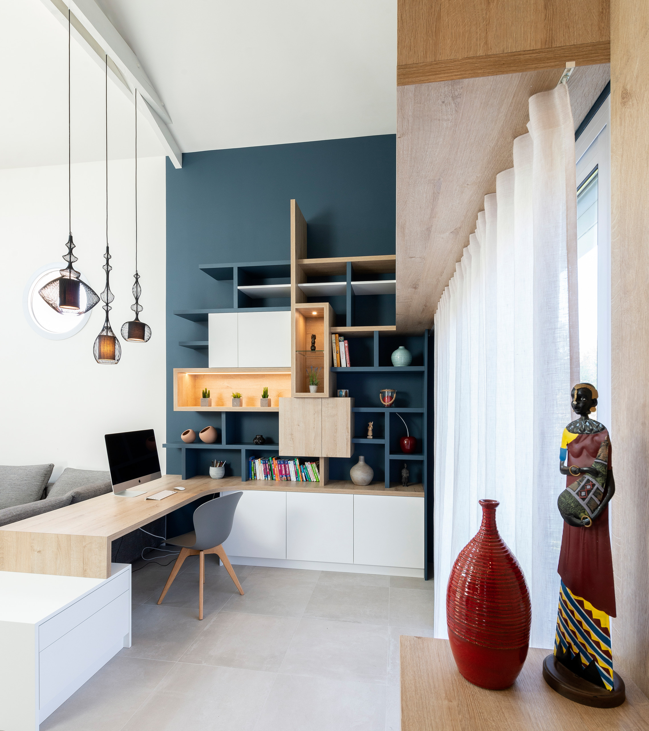 2. Couch-Potato. Direkt nach der Arbeit aufs Sofa? In diesem Home-Office ist das ein Kinderspiel. Das Innenarchitekten-Team von INTERIEURS CREATIFS gestaltete den Freiraum im Wohnzimmer zum Home-Office aus einem Guss. Der maßgeschneiderte Schreibtisch wurde mit Blick in den Raum ausgerichtet.