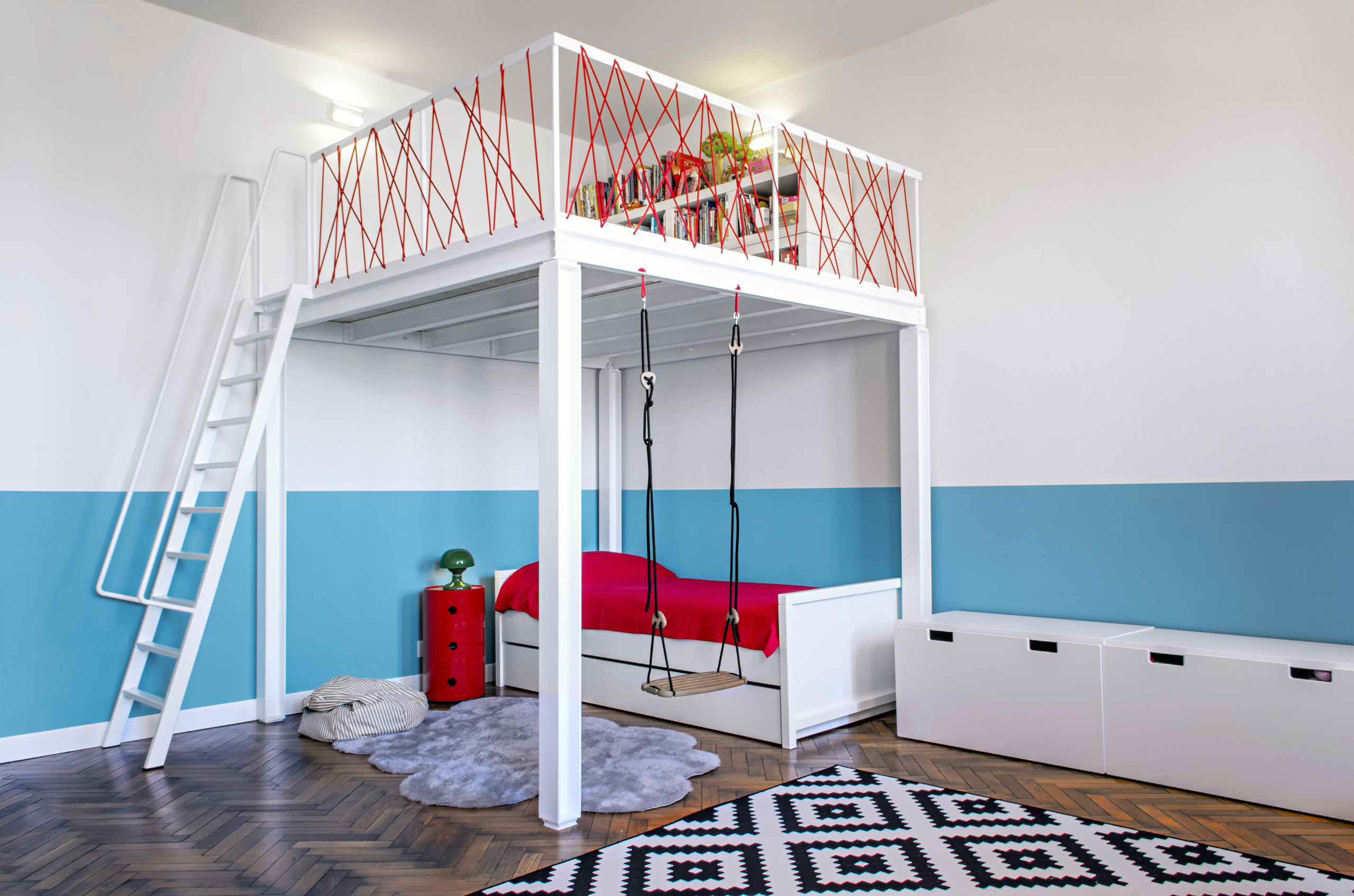 Darunter kann der Platz für den Schreibtisch oder die Kuschelecke genutzt werden – das ist nicht nur in kleinen Kinderzimmern von Vorteil.