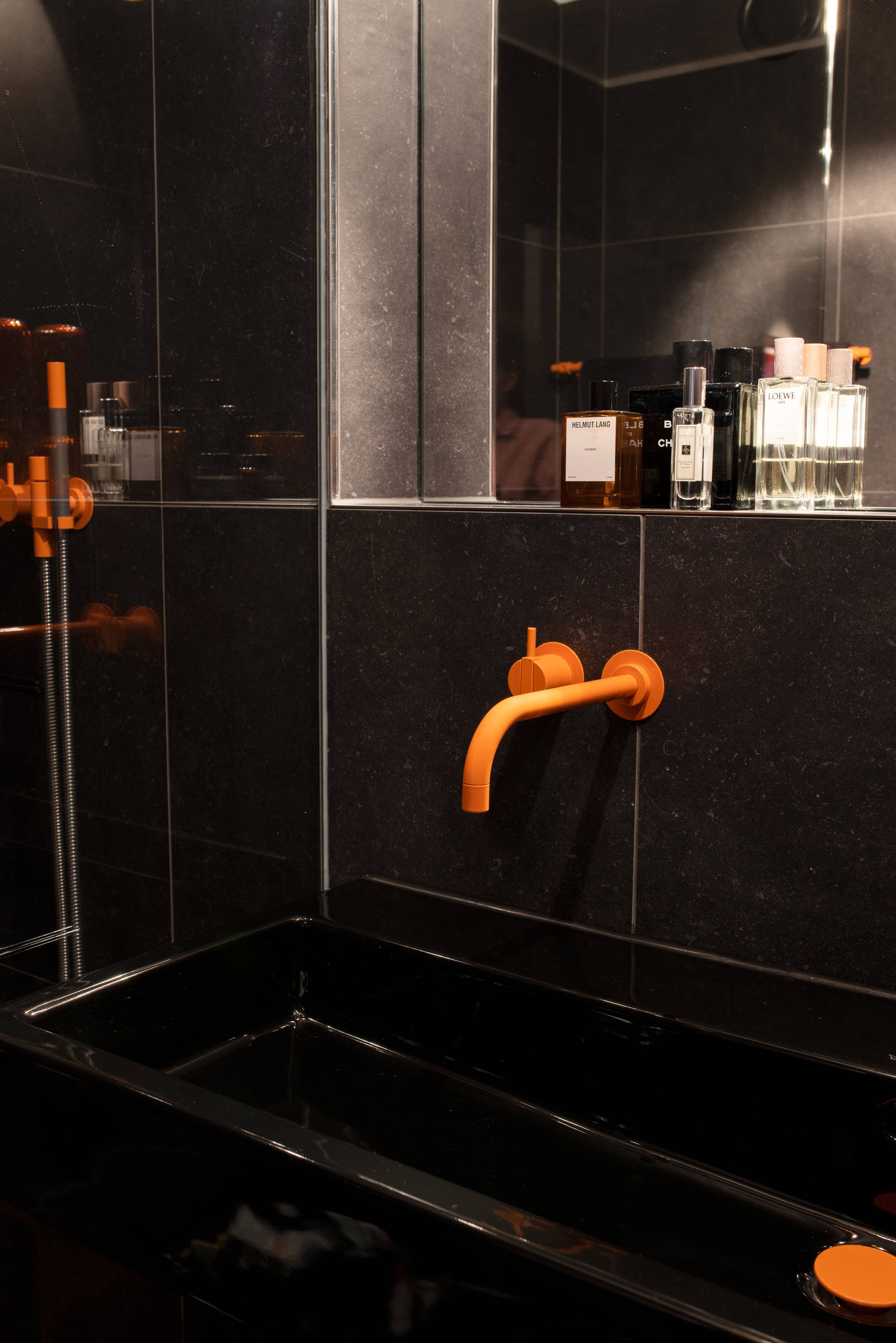 Die Bestandstüren wurden neu gestrichen und mit neuen Griffen versehen. Die Jalousien vor den Fenstern sind ebenfalls neu, passen aber perfekt zum Stil der Wohnung. Ganz neu sind auch die Bäder, dunkel im Stil der Wohnung, mit schwarzen Fliesen und Sanitärobjekten sowie knallig orangefarbenen Armaturen.