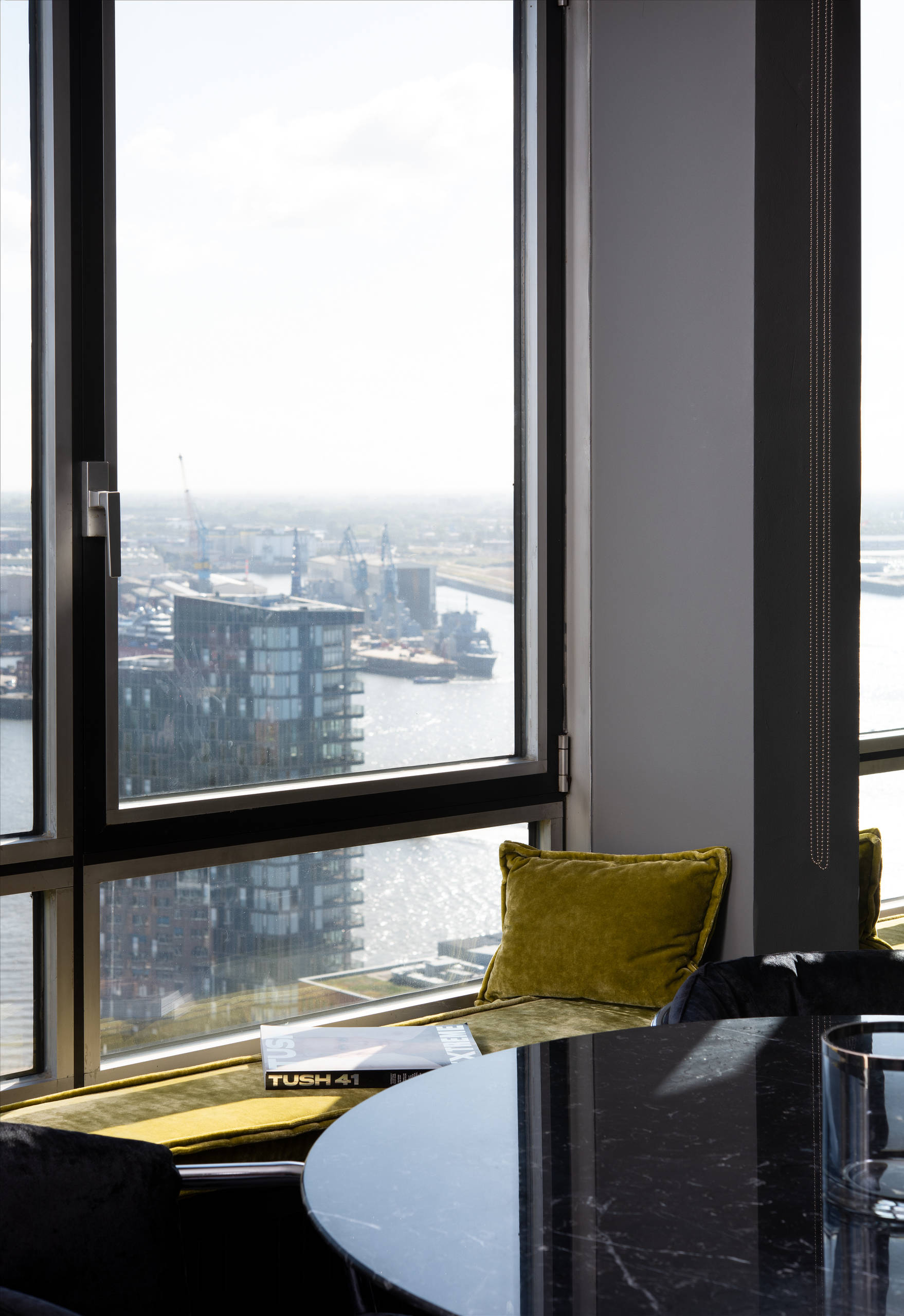 „Die Wohnung ist sehr hell. Sie scheint fast über der Stadt zu schweben“, schwärmt die Innenarchitektin Arzu Kartal. Sie ist begeistert vom Ausblick über Elbe und Hafenanlagen.