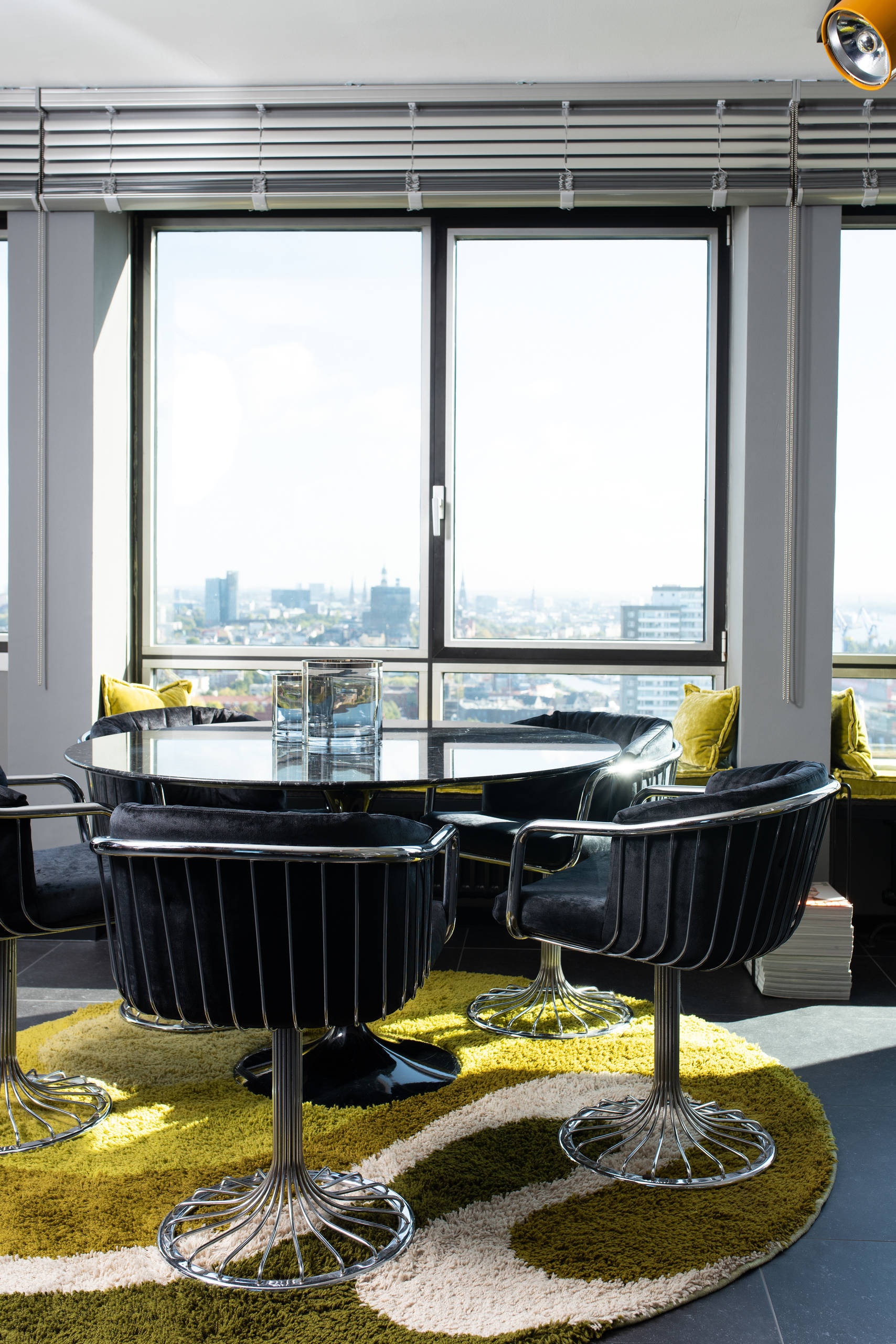 Olivgrüne Polster und organische Formen: In dieser Hamburger Hochhaus-Wohnung würde sich auch James Bond wohlfühlen