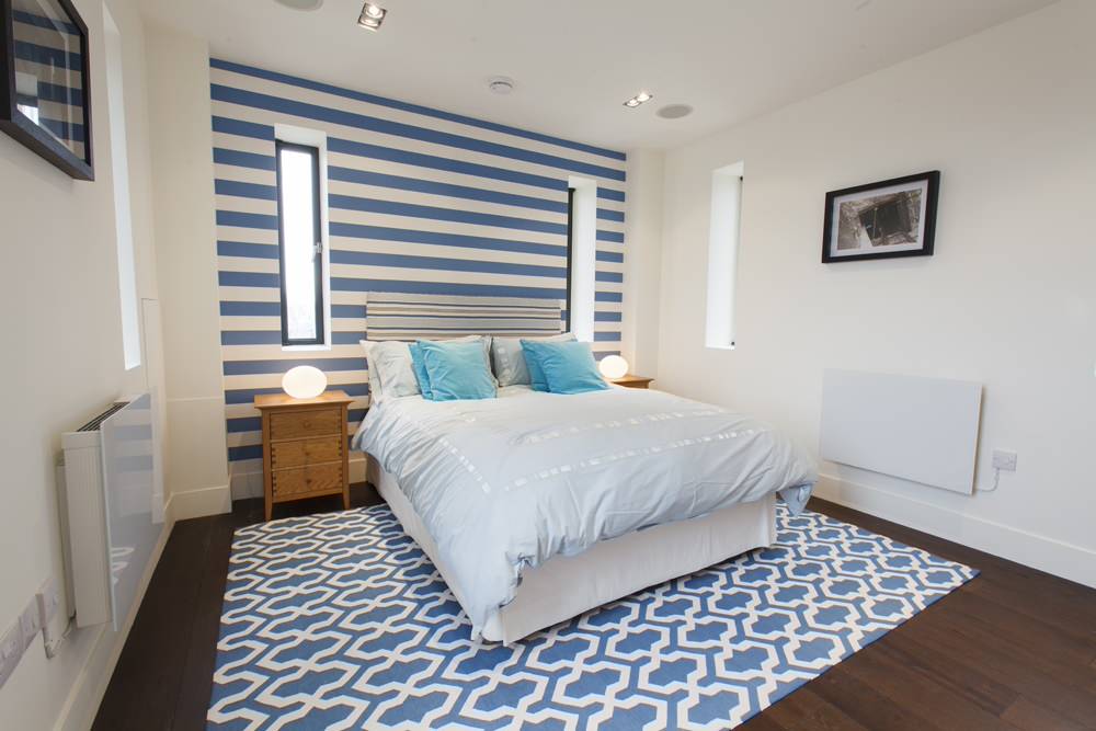 Nicht nur mit einer Farbfläche, auch durch Muster und Querstreifen können Sie zusätzliche Effekte erzielen. So lassen die blauen Streifen dieses Schlafzimmer und die schmalen Fenster optisch breiter wirken.