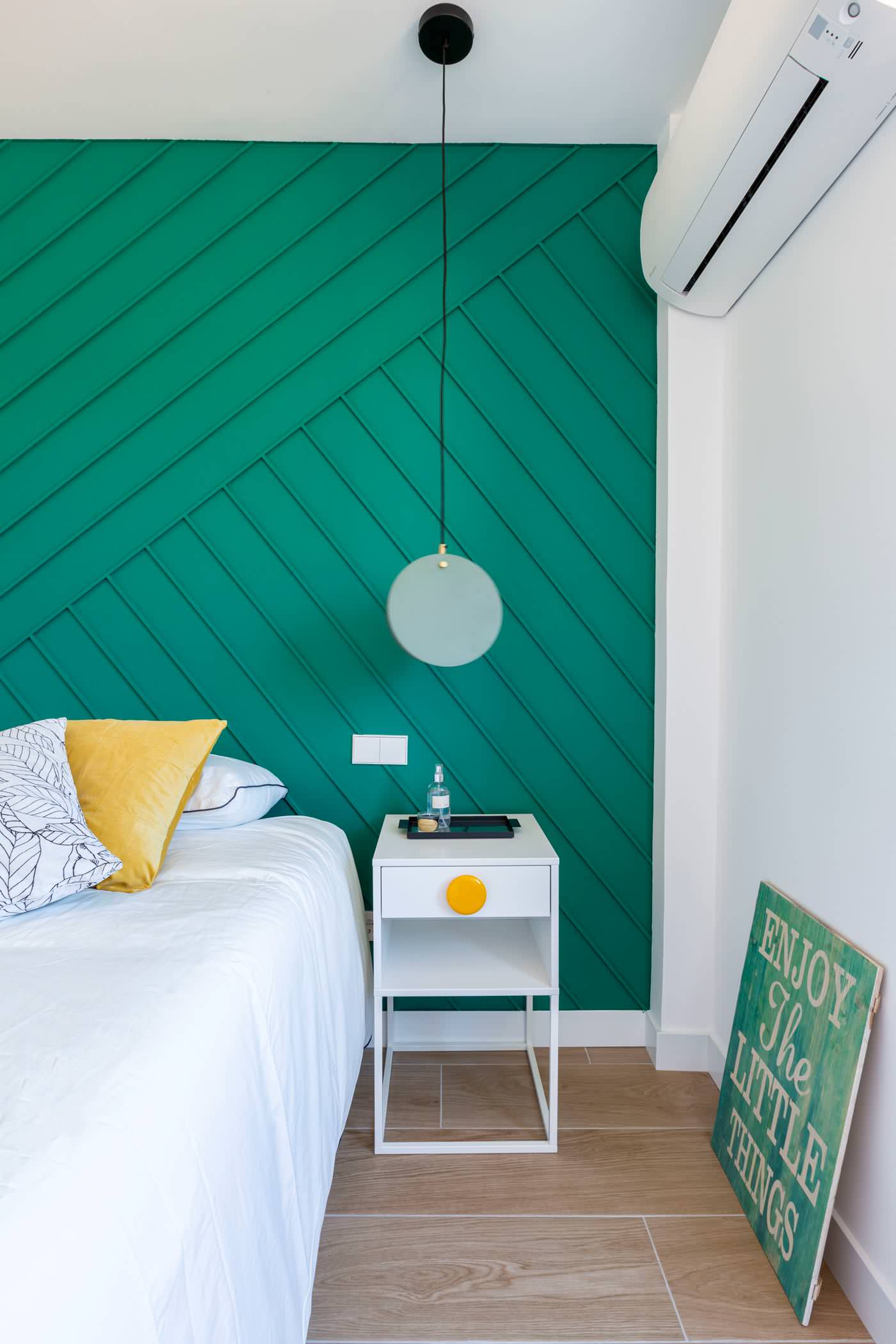 7. Starke, intensive Farbtöne. Ein intensives Blau, Petrol, Grün, Rot oder Gelb eignet sich gut für Akzentwände. Sie sind sich unsicher, ob Sie eine allzu leuchtende Farbe vielleicht schon bald satthaben? Fügen Sie einfach etwas schwarze Abtönfarbe hinzu – so wirkt der Farbton gedämpfter und zeitloser.