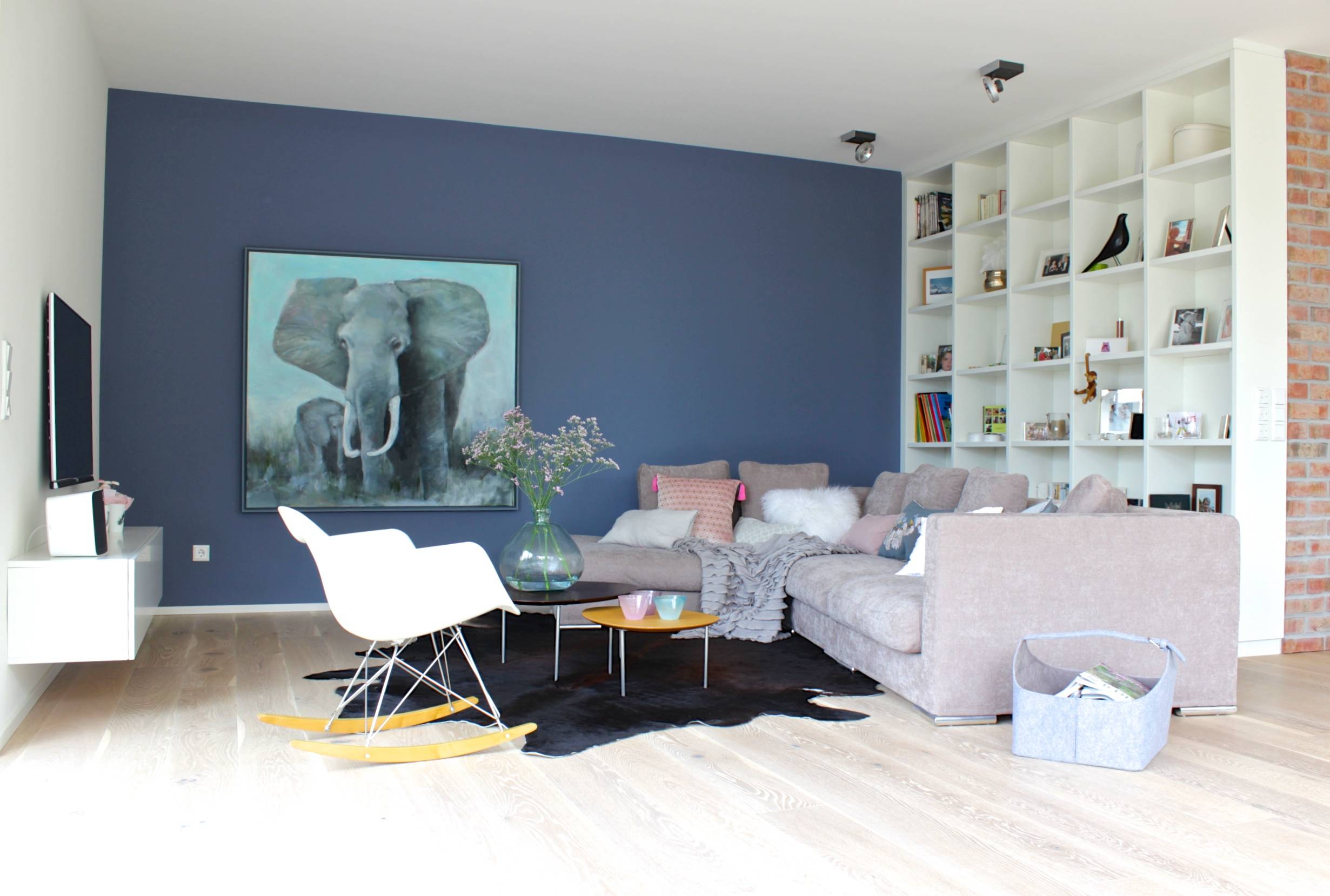 8. Bewusste Kontraste. Gleich oder verschieden? Antwort: Ganz nach Ihrem Gusto. In diesem Wohnzimmer wirkt die Akzentwand als Kontrast zu den dominierenden hellen Farben im Raum und sticht dadurch wunderbar heraus.