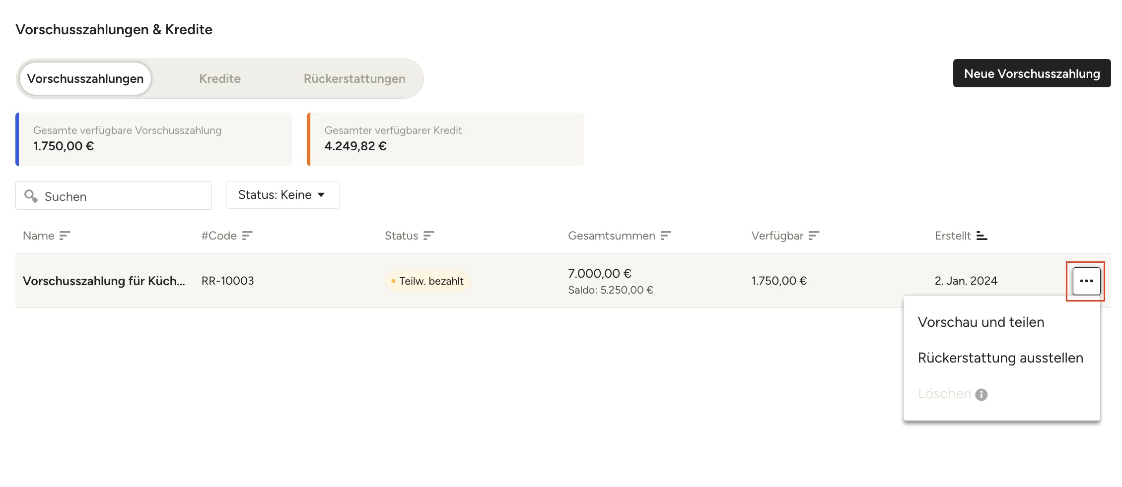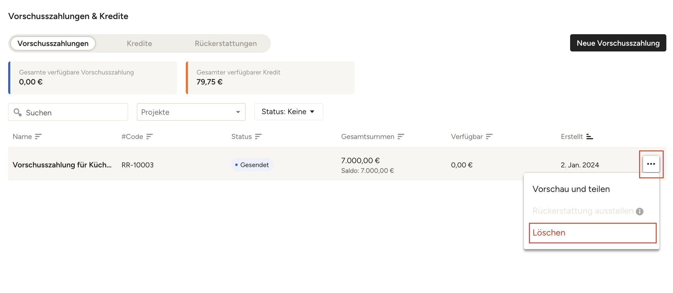 Um eine Vorschusszahlung zu löschen, klicken Sie auf das drei-Punkte-Icon rechts und wählen „Löschen“. Sie werden aufgefordert, den Vorgang zu bestätigen – er kann nicht widerrufen werden.