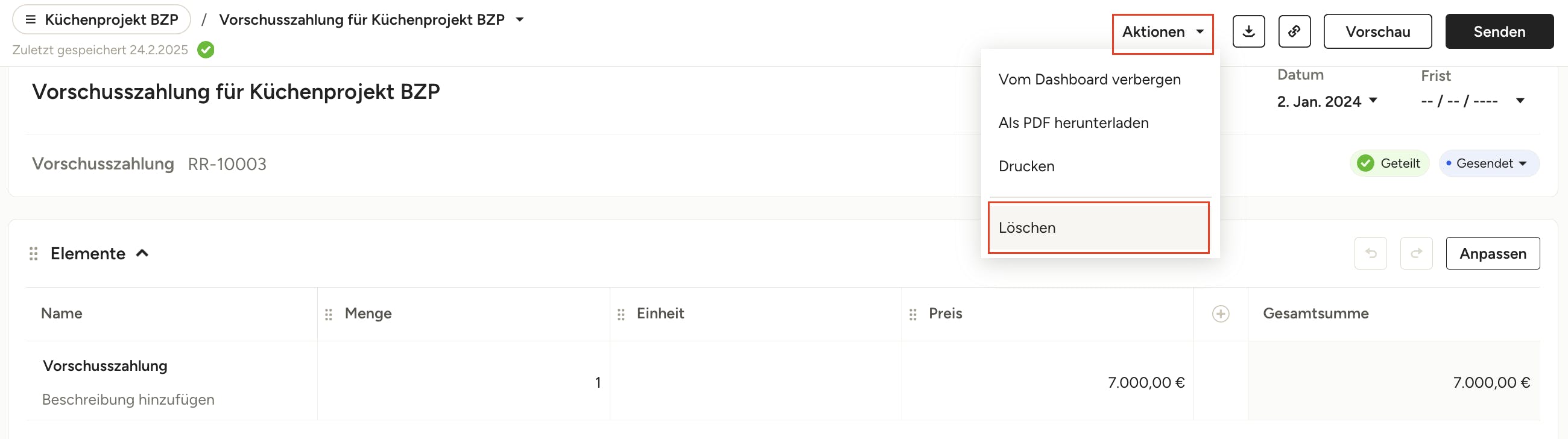 Wenn Sie eine Vorschusszahlung aus dem Dokument heraus löschen möchten, öffnen Sie die Vorschusszahlung, klicken Sie oben auf das Menü „Aktionen“ und wählen Sie „Löschen“. Sie werden aufgefordert, den Vorgang zu bestätigen – er kann nicht widerrufen werden.