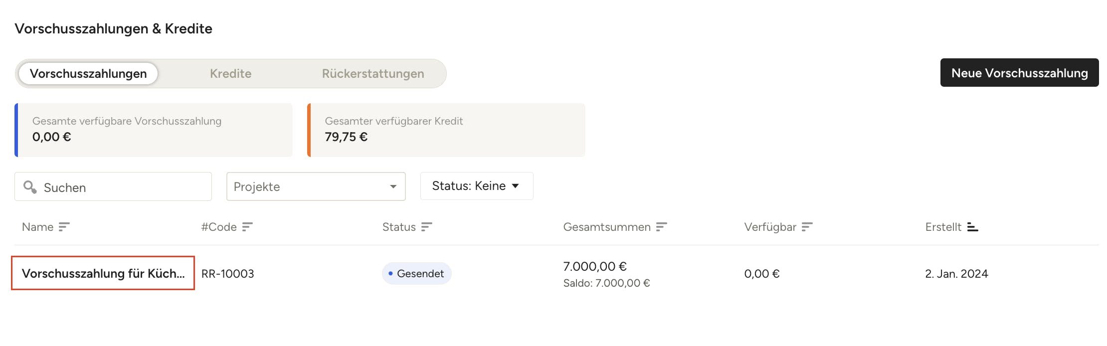 Ihre neue Vorschusszahlung wird nun auf der Seite „Vorschusszahlungen & Kredite“ für Ihr Projekt angezeigt. Dort können Sie alle bisherigen Vorschusszahlungen suchen und sortieren.