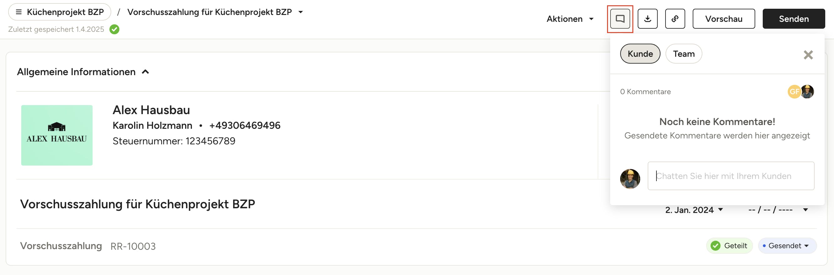 Sobald Sie Ihre Anfrage für eine Vorschusszahlung mit dem Kunden/der Kundin geteilt haben, können Sie über die Kommentarfunktion oben im Dokument direkt mit ihm/ihr (und den Teammitgliedern) kommunizieren. So können Sie ganz einfach auf Dokumentdetails verweisen, die Sie gerade besprechen, und die Unterhaltung übersichtlich gestalten. Weitere Informationen finden Sie in diesem Artikel.