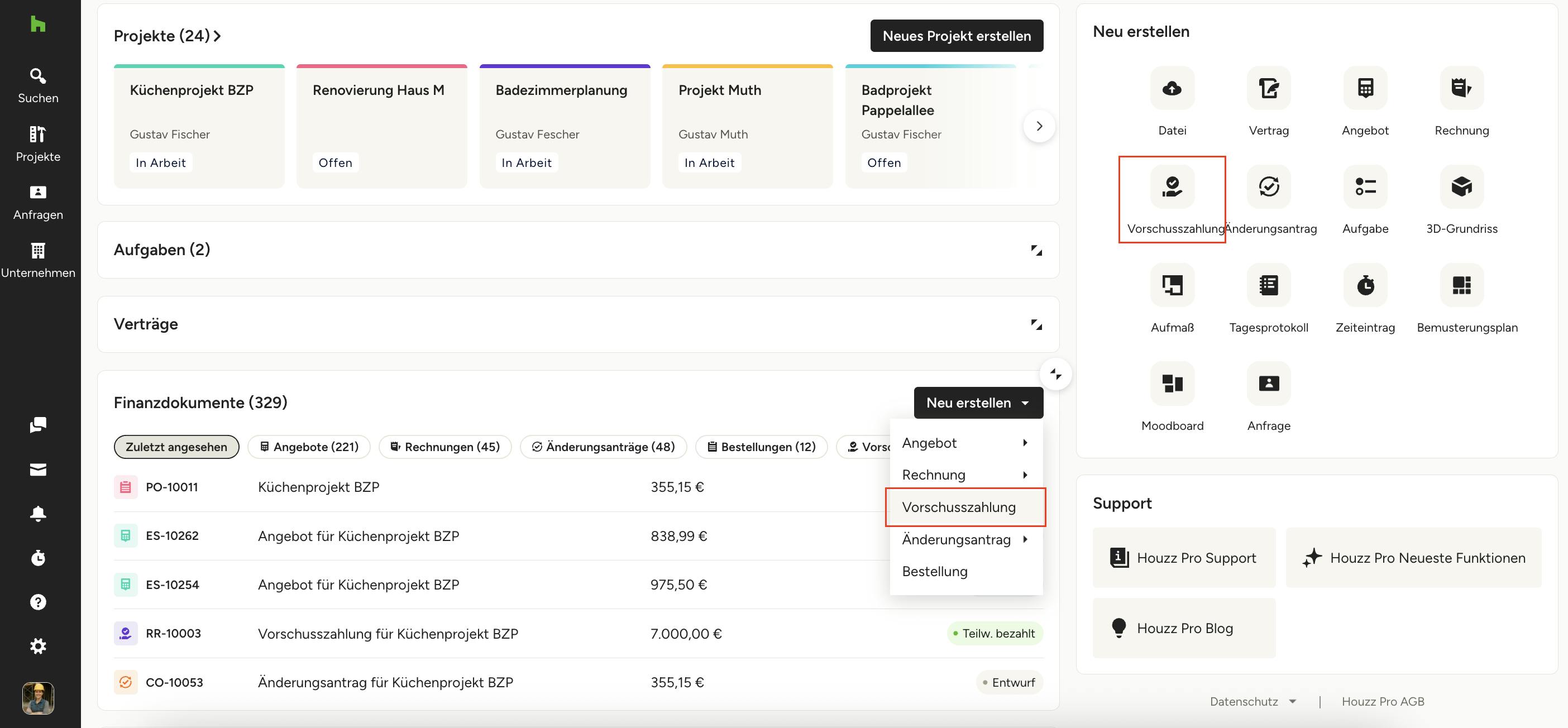 Auf Ihrer Houzz Pro- Homepage können Sie schnell eine Vorschusszahlung erstellen, indem Sie auf das Vorschusszahlung-Symbol im Abschnitt „Neu erstellen“ klicken oder indem Sie das Dropdown-Menü „Neu erstellen“ im Abschnitt „Finanzdokumente“ verwenden und „Vorschusszahlung“ auswählen.