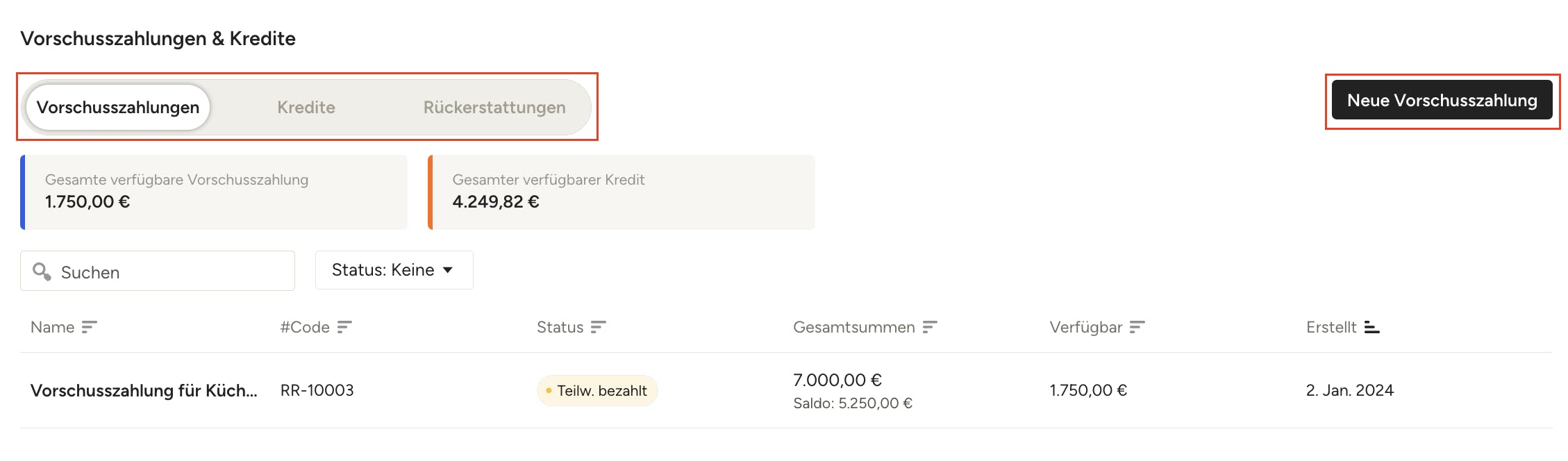 Prüfen Sie, dass im oberen Menü „Vorschusszahlungen“ ausgewählt sind. Klicken Sie oben rechts auf „Neue Vorschusszahlung“, um eine neue Vorschusszahlung zu erstellen.